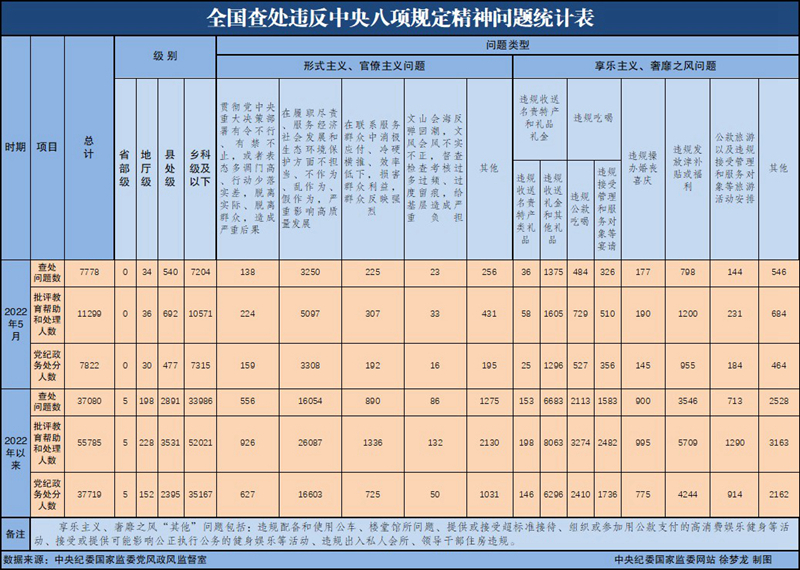 6月27日,中央紀(jì)委國(guó)家監(jiān)委公布了2022年5月全國(guó)查處違反中央八項(xiàng)規(guī)定精神問題匯總情況。當(dāng)月,全國(guó)共查處違反中央八項(xiàng)規(guī)定精神問題7778起,批評(píng)教育幫助和處理11299人,其中,黨紀(jì)政務(wù)處分7822人,這是連續(xù)第105個(gè)月公布月報(bào)數(shù)據(jù)。