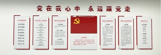 黨建墻分為六個部分:黨旗,入黨誓詞,偉大建黨精神,以史為鑒、開創(chuàng)未來,國有企業(yè)黨的建設(shè),建筑設(shè)計院核心價值觀和企業(yè)愿景。