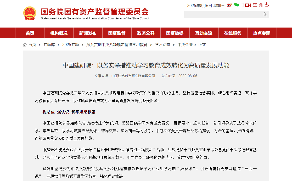 中國建研院黨委把開展深入貫徹中央八項(xiàng)規(guī)定精神學(xué)習(xí)教育作為重要的政治任務(wù),堅(jiān)持緊密結(jié)合實(shí)際,精心組織實(shí)施,確保學(xué)習(xí)教育有力有序開展,以作風(fēng)建設(shè)新成效為公司高質(zhì)量發(fā)展提供堅(jiān)強(qiáng)保障。