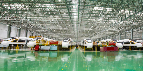 ▲中車長客“復興號”中國標準動車組裝配現(xiàn)場