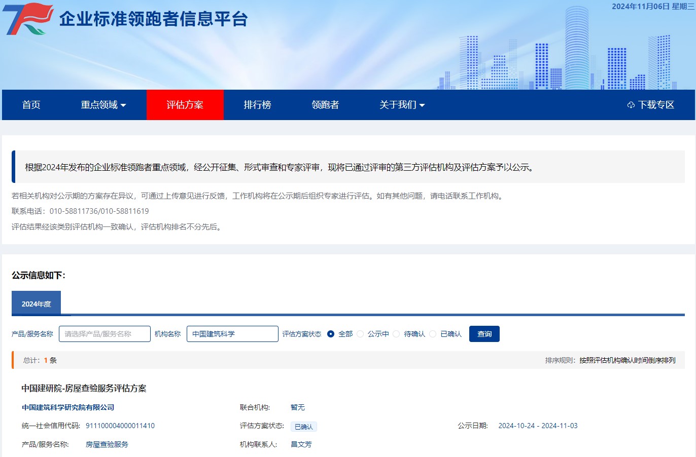11月5日,企業(yè)標(biāo)準(zhǔn)領(lǐng)跑者信息平臺公布,中國建研院認(rèn)證中心被確認(rèn)為“房屋查驗(yàn)服務(wù)”企業(yè)標(biāo)準(zhǔn)“領(lǐng)跑者”評估機(jī)構(gòu),受權(quán)開展房屋查驗(yàn)服務(wù)方面的企業(yè)標(biāo)準(zhǔn)水平評估工作。