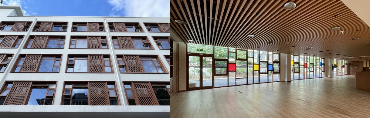 建筑改造難點(diǎn):改造前建筑首層為倉(cāng)庫(kù),二至五層為配套用房。根據(jù)老年人照料設(shè)施的各項(xiàng)要求,增設(shè)消防電梯并改動(dòng)樓梯位置以滿足消防疏散的要求。項(xiàng)目首層進(jìn)深大、采光差,改造中合理組織功能,改造中部采光不佳的空間,將原有井字梁保留,拆除頂板,設(shè)置錐形天窗,引入自然光和自然通風(fēng),使原本昏暗的空間變得充滿生機(jī);同時(shí)圍繞主空間,合理布置各類功能空間。二至五層選擇合理位置設(shè)公共起居室,老人居室門局部后退,同時(shí)交錯(cuò)布置,讓單調(diào)的走廊空間富于變化。二至五層層高僅3.15米,原結(jié)構(gòu)形式為井字梁,建筑空間結(jié)合井字梁位置布局,除走廊外不設(shè)吊頂,盡量保證舒適的空間尺度。走廊部分與機(jī)電專業(yè)協(xié)作,合理布置管道,避免排煙主管穿越主梁下方空間,保證凈空高度滿足疏散要求;機(jī)電設(shè)計(jì)盡量利用原有系統(tǒng),減少改動(dòng)量,控制造價(jià)。因項(xiàng)目位于城市中心區(qū),與南側(cè)居民樓距離不足20米,外立面利用原有結(jié)構(gòu)框架,采用標(biāo)準(zhǔn)窗單元及保溫復(fù)合一體板,保證建成效果的同時(shí)避免復(fù)雜施工對(duì)周邊居民造成的干擾。