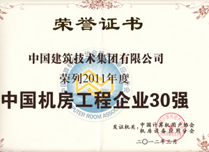 中技集團榮獲2011年度中國數(shù)據(jù)中心行業(yè)優(yōu)秀機房工程企業(yè)30強榮譽稱號