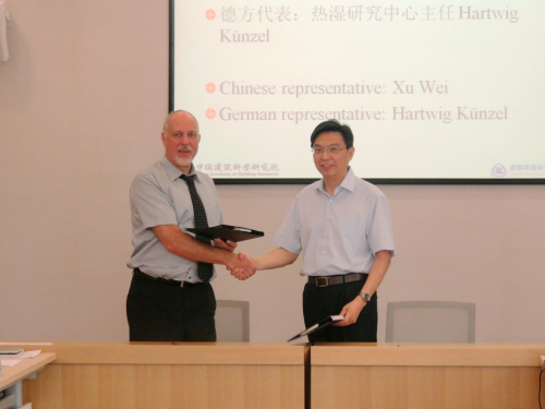 6月24-26日,建筑圍護結構熱濕過程國際研討會在我院順利召開。我院王清勤副院長出席會議并致歡迎詞。環(huán)能院徐偉院長代表環(huán)能院與德國Fraunhofer IBP建筑物理研究所簽訂了科研合作合同。該合作旨在推進我院關于建筑圍護結構熱濕過程和建筑熱濕環(huán)境方面的研究,涉及國際項目申請、實驗室建設、軟件開發(fā)和培訓等多個方面,將持續(xù)三年。