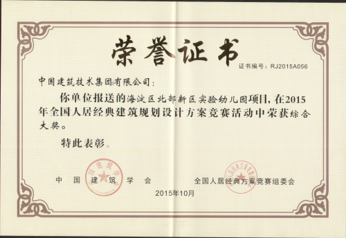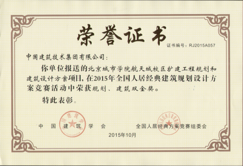 中技集團(tuán)建筑設(shè)計院羅雋創(chuàng)作室設(shè)計的“海淀區(qū)北部新區(qū)實驗幼兒園項目”和”北京城市學(xué)院航天城校區(qū)擴(kuò)建項目”分別獲得由“中國建筑學(xué)會”主辦的2015年“全國人居經(jīng)典建筑規(guī)劃設(shè)計方案競賽”綜合大獎、及規(guī)劃和建筑雙金獎。