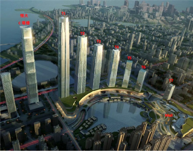 項目位于合肥濱湖新區(qū)核心地塊,緊鄰巢湖,T1塔樓東面毗鄰518m高的恒大中心塔樓,主要建筑功能為商業(yè)、辦公和酒店。塔樓地上119層,地下5層,建筑平面呈方形,存在高度、剛度突變、樓板開大洞、加強(qiáng)層、構(gòu)件間斷、承載力突變、穿層墻柱等復(fù)雜結(jié)構(gòu)超限情況。