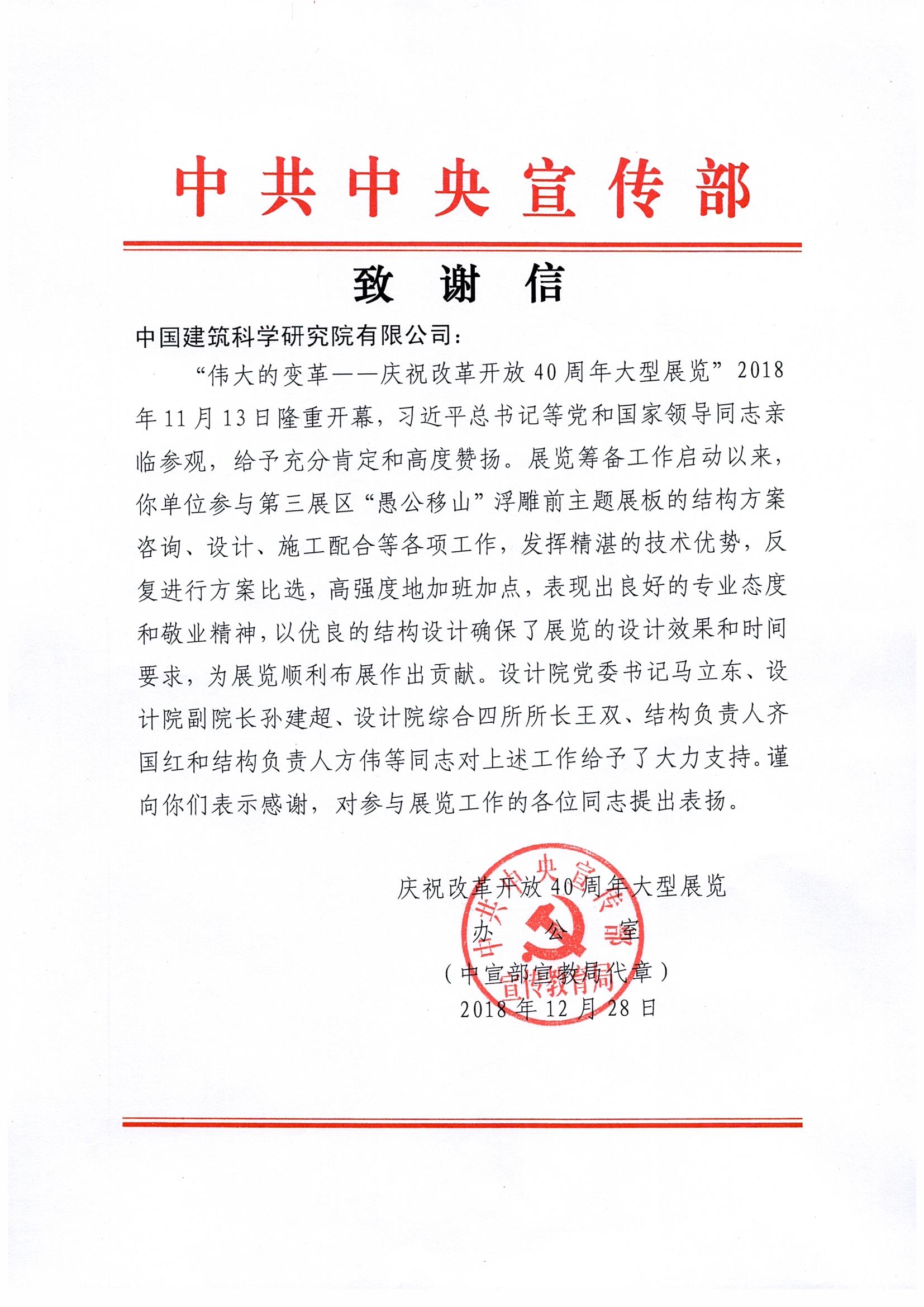 近日,公司收到中共中央宣傳部宣傳教育局發(fā)來的致謝信。該致謝信對(duì)公司建筑設(shè)計(jì)院黨委書記馬立東、副院長孫建超、綜合四所所長王雙、結(jié)構(gòu)負(fù)責(zé)人齊國紅和方偉等同志,在“偉大的變革-慶祝改革開放40周年大型展覽”第三展區(qū)“愚公移山”浮雕前主題展板的結(jié)構(gòu)方案、咨詢、設(shè)計(jì)、施工配合等各項(xiàng)工作中的大力支持和出色表現(xiàn)提出了表揚(yáng)。