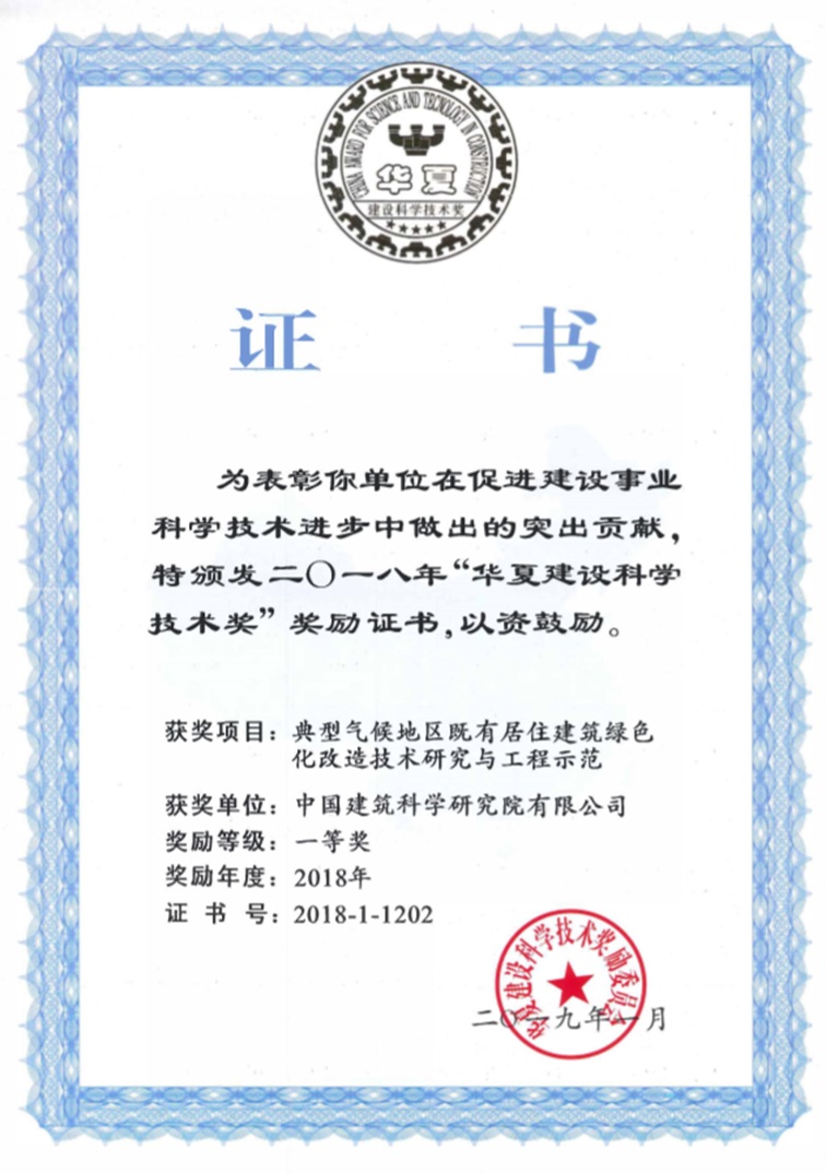 公司深圳分公司與上海市建筑科學(xué)研究院(集團)有限公司、哈爾濱工業(yè)大學(xué)共同完成的“十二五”國家科技支撐計劃課題《典型氣候地區(qū)既有居住建筑綠色化改造技術(shù)研究與工程示范》榮獲2018年華夏建設(shè)科學(xué)技術(shù)獎一等獎。