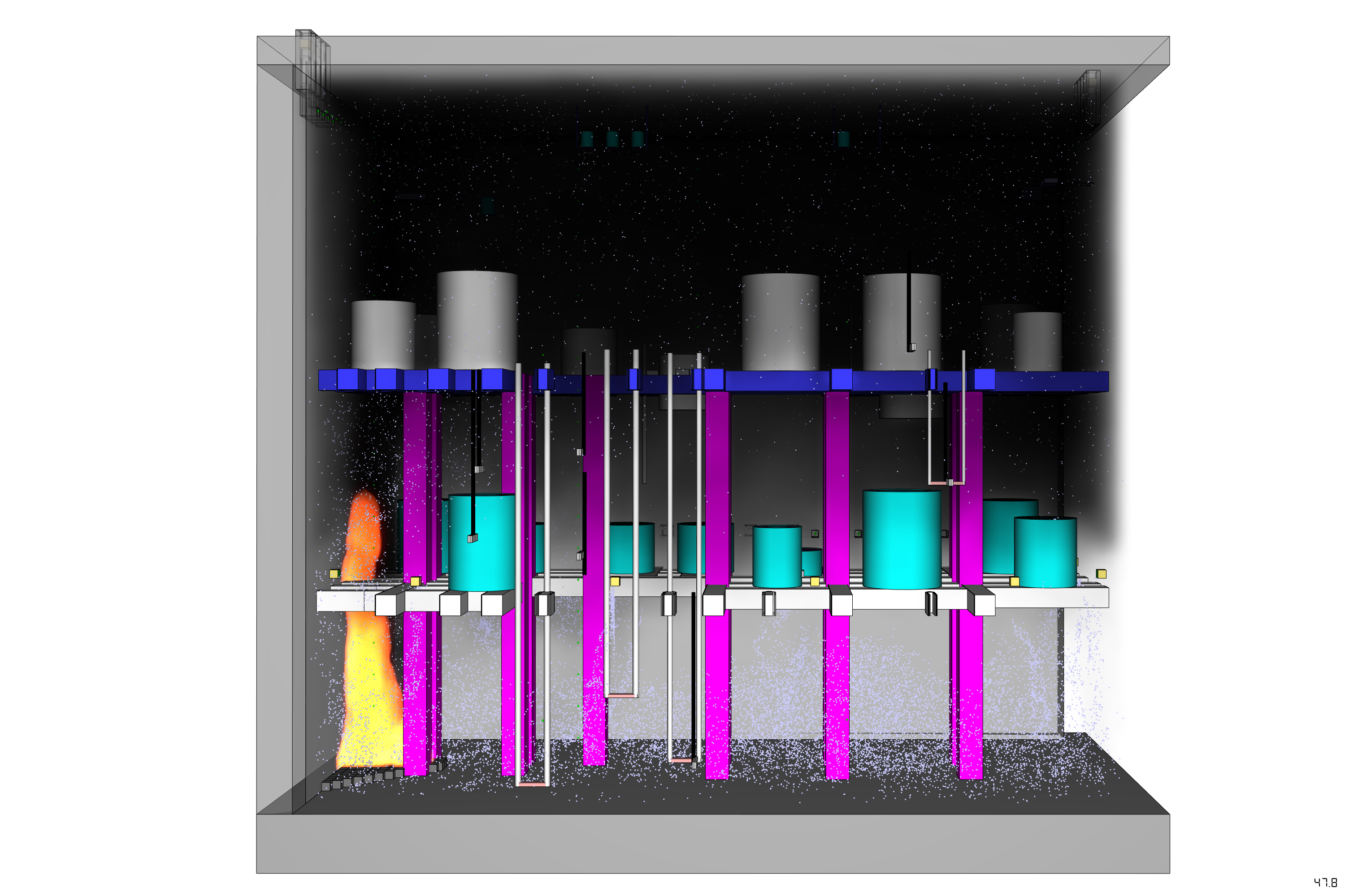 后處理廠紅區(qū)設(shè)備室具有放射性水平高、污染等級高等特點(diǎn),其滅火設(shè)計(jì)需要兼顧減少放射性泄漏的要求,目前沒有針對性的滅火設(shè)計(jì)規(guī)范及標(biāo)準(zhǔn)。2018年底,防火所承擔(dān)了后處理廠火災(zāi)工況的數(shù)模分析研究任務(wù)。此后近一年時(shí)間里,項(xiàng)目組針對設(shè)備室內(nèi)的煤油和磷酸三丁酯(TBP)開展了燃燒特性基礎(chǔ)試驗(yàn)研究;構(gòu)建了等比例的數(shù)值模型,先后設(shè)計(jì)了近千種火災(zāi)工況對設(shè)備室窒息滅火、二氧化碳(CO2)氣體滅火及預(yù)防滅火的效果進(jìn)行模擬分析,得出了火災(zāi)持續(xù)時(shí)間、溫升趨勢、壓力變化梯度等關(guān)鍵性滅火設(shè)計(jì)指標(biāo)。