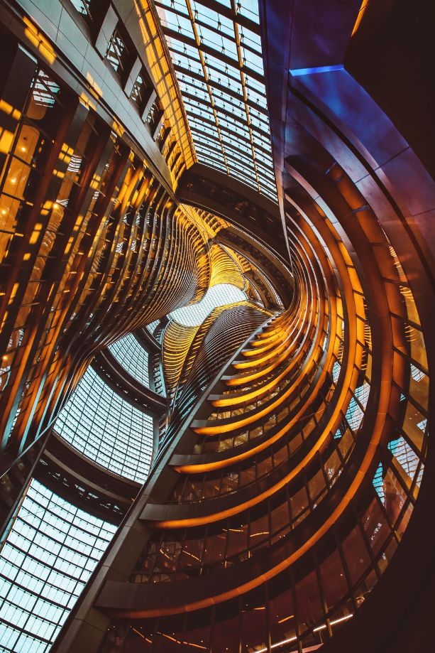 麗澤SOHO總建筑面積17萬平方米,地下4層,地上45層,建筑高度200米,將被打造為超高層國際5A級寫字樓。她的設計靈感來源于DNA的雙螺旋結(jié)構(gòu),塔樓由兩個反對稱單塔組成,兩個單塔核心筒體的位置保持不變,中庭邊線由底部至頂部逐層逆時針旋轉(zhuǎn)45度。流線型盤旋而上的塔體與200m通高的中庭相互呼應,形成一種盤旋而上直升天空的空間體驗。