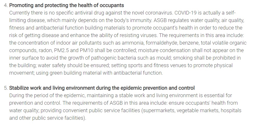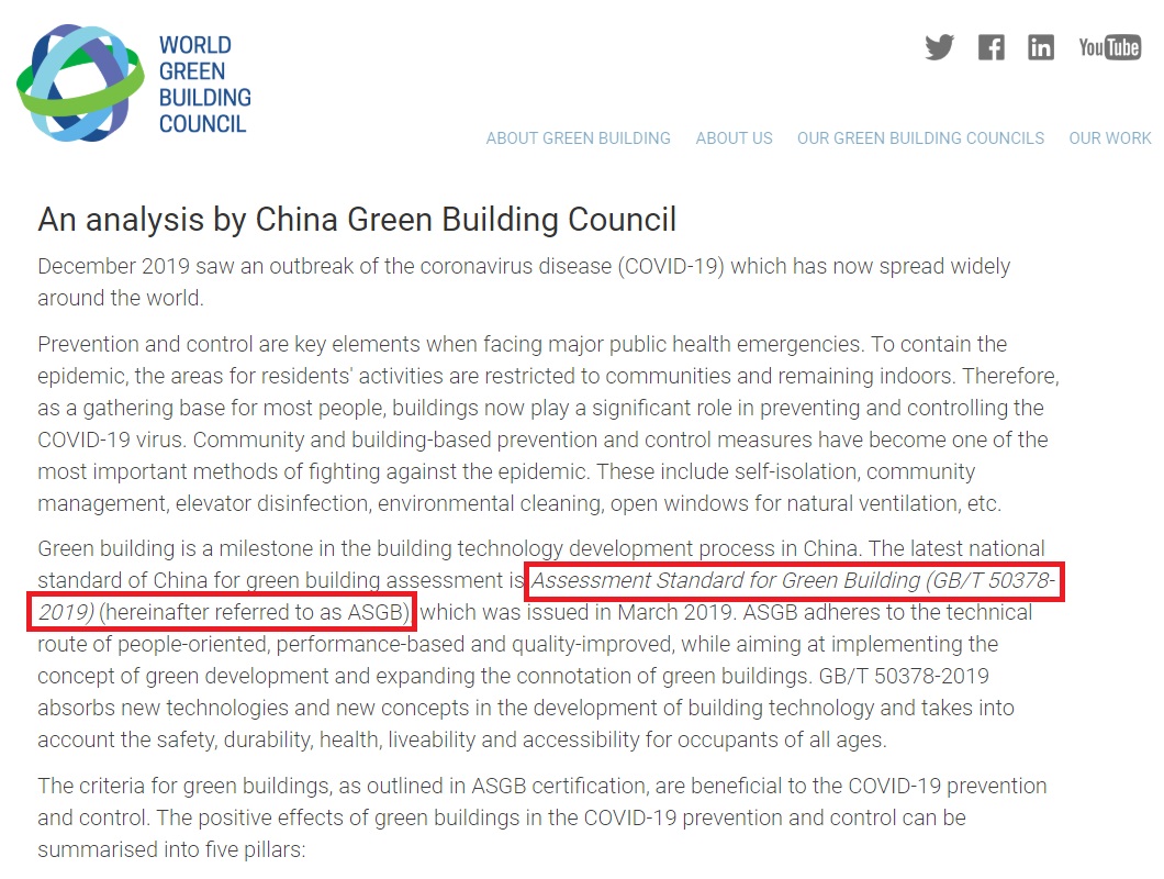 2020年3月23日,世界綠色建筑協(xié)會(World Green Building Council)發(fā)文刊登中國綠色建筑在應(yīng)對新型冠狀病毒肺炎(COVID-19)中的貢獻(xiàn)。文中指出綠色建筑是中國建筑科技發(fā)展過程中的重要里程碑,充分肯定了《綠色建筑評價標(biāo)準(zhǔn)》GB/T 50378-2019在疫情防控中的積極作用。