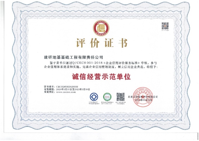 經(jīng)評價機構(gòu)審核,建研地基順利通過“重合同守信用企業(yè)”和“誠信經(jīng)營示范單位”的評審。
