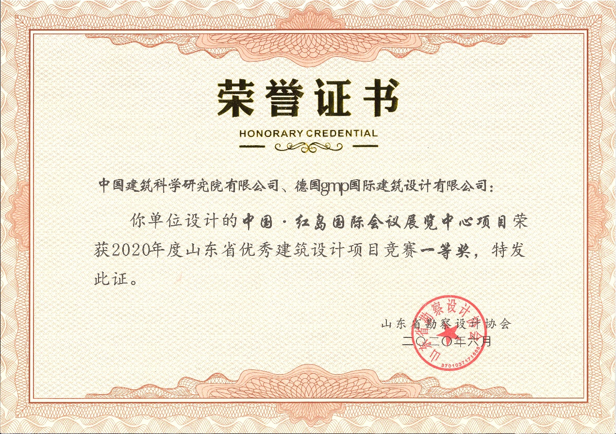 10月23日,由德國(guó)gmp國(guó)際建筑設(shè)計(jì)有限公司與公司聯(lián)合設(shè)計(jì)的中國(guó)·紅島國(guó)際會(huì)議展覽中心項(xiàng)目在2020年度山東省勘察設(shè)計(jì)協(xié)會(huì)優(yōu)秀建筑設(shè)計(jì)項(xiàng)目競(jìng)賽中榮獲一等獎(jiǎng)。