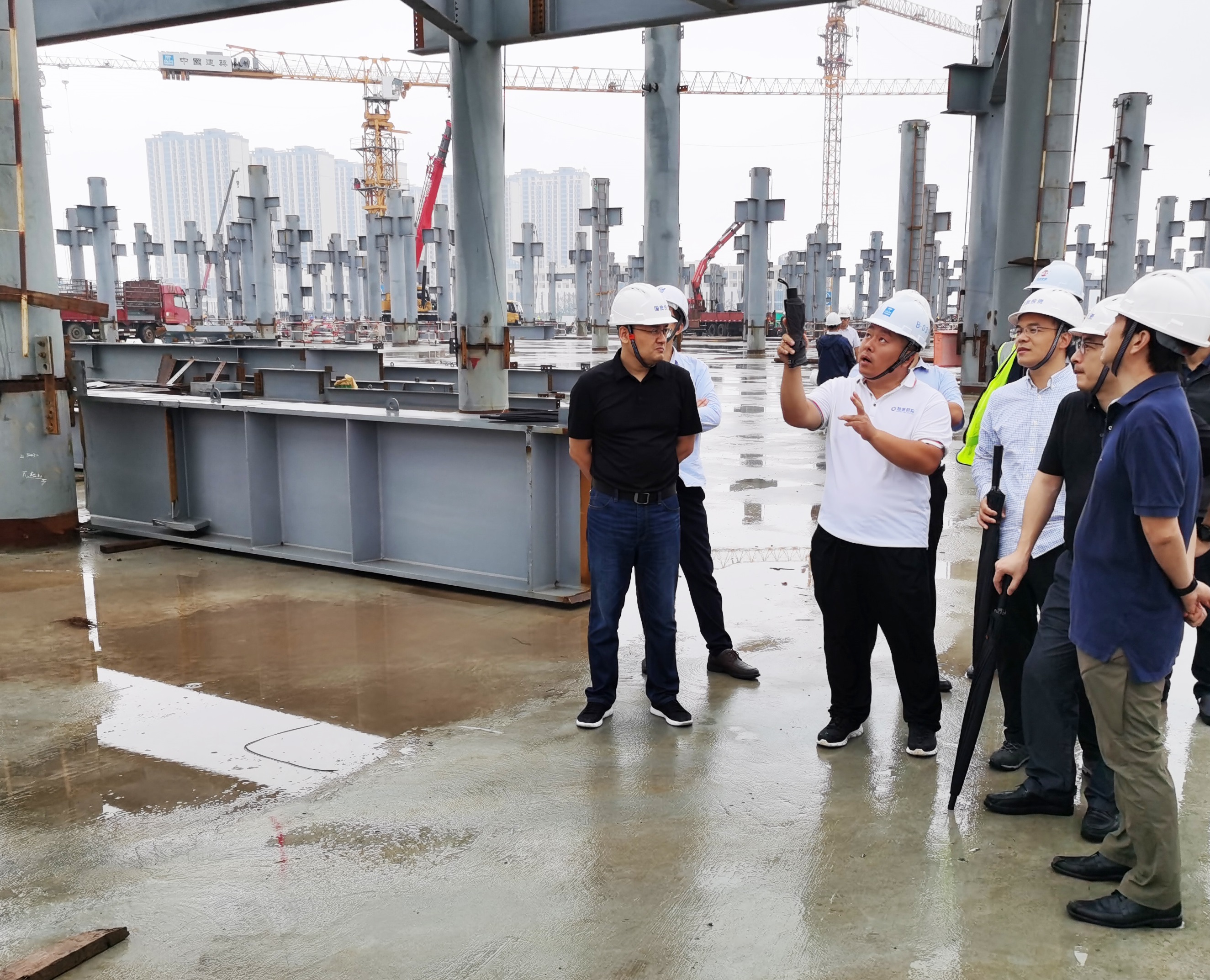 肖從真一行調(diào)研了鋼結(jié)構(gòu)安裝工程的進(jìn)展情況以及鋼結(jié)構(gòu)節(jié)點(diǎn)施工的具體措施,并在現(xiàn)場(chǎng)交流會(huì)上對(duì)該項(xiàng)目消能減震設(shè)計(jì)進(jìn)行技術(shù)交底。