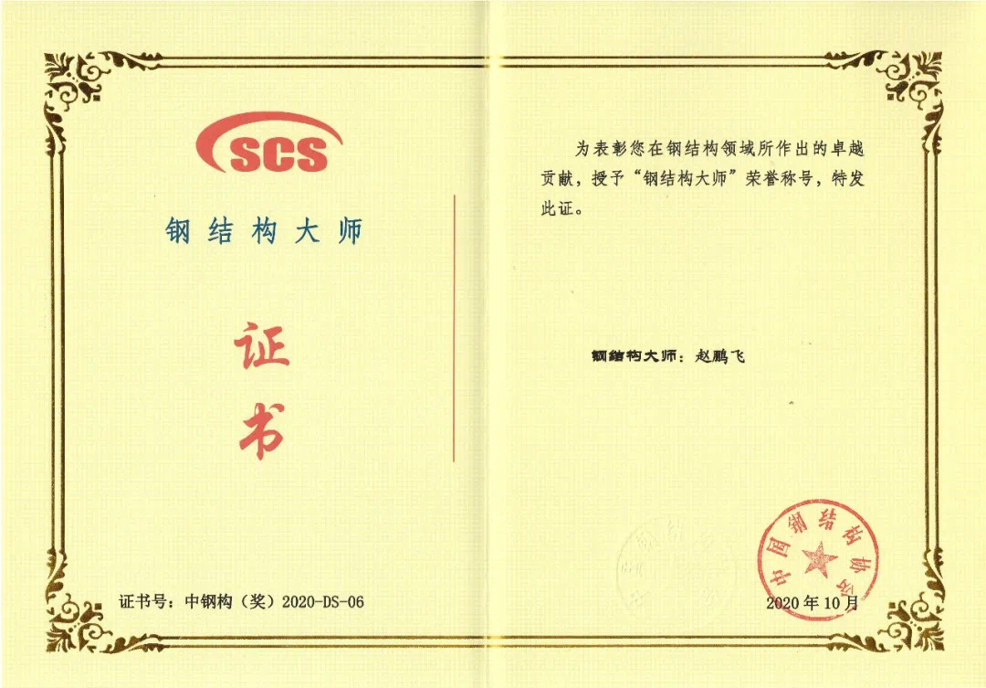 2020年11月12日,公司建研科技工程咨詢設計院副院長趙鵬飛榮獲由中國鋼結構協(xié)會頒發(fā)的“中國鋼結構大師”榮譽稱號。
