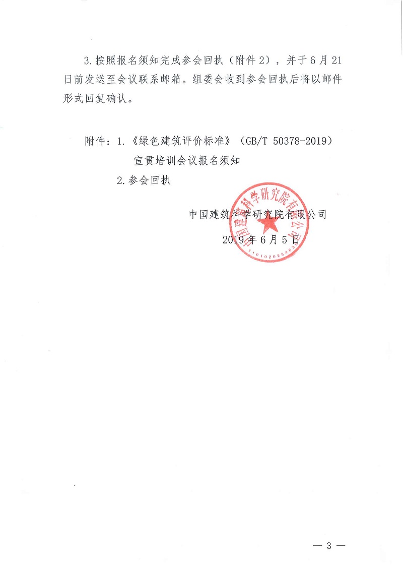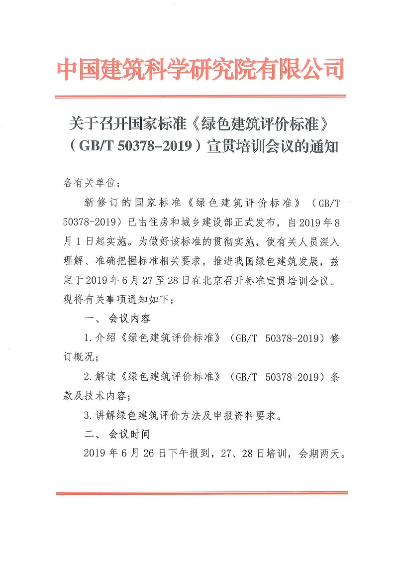 新修訂的國(guó)家標(biāo)準(zhǔn)《綠色建筑評(píng)價(jià)標(biāo)準(zhǔn)》(GB/T 50378-2019)已由住房和城鄉(xiāng)建設(shè)部正式發(fā)布,自2019年8月1日起實(shí)施。為做好該標(biāo)準(zhǔn)的貫徹實(shí)施,使有關(guān)人員深入理解、準(zhǔn)確把握標(biāo)準(zhǔn)相關(guān)要求,推進(jìn)我國(guó)綠色建筑發(fā)展,作為主編單位,中國(guó)建研院定于2019年6月27日至28日在北京召開(kāi)標(biāo)準(zhǔn)宣貫培訓(xùn)會(huì)議。