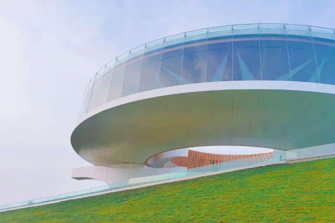 該藝術中心是一座充滿未來科技感的藝術館建筑,集展示、會議和觀光功能為一體,360度觀景環(huán)廊、流動延伸的建筑曲線,遠遠望去猶如一艘飛船。觀景環(huán)廊僅在內環(huán)處設有三個支點,與下部混凝土結構相連。支點處的桁架豎腹桿加粗,直接深入下部混凝土結構當中,既保證了支座的安全性,又將鋼結構的支點巧妙的“藏”了起來。為了進一步達到“漂浮通透”的效果,外立面不出現(xiàn)結構構件,觀景環(huán)廊從內環(huán)支點處又向外懸挑了8.5米,懸挑端的最大跨度達到了68米,為標準足球場的寬度。在施工過程中,工程師們親赴施工現(xiàn)場,測量了最大跨懸挑端的豎向振動,確認結構的振動舒適度滿足要求。