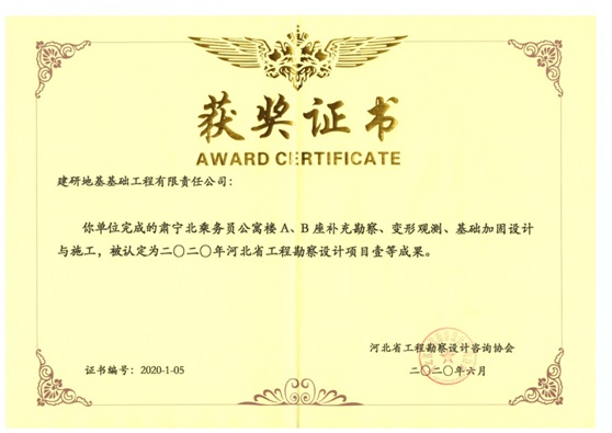 2020年5月,河北省工程勘察設(shè)計咨詢協(xié)會下發(fā)文件《關(guān)于公布2020年河北省工程勘察設(shè)計項目成果認(rèn)定結(jié)果的通知》,建研地基申報的“肅寧北乘務(wù)員公寓樓A、B座補(bǔ)充勘察、變形觀測、基礎(chǔ)加固設(shè)計與施工”項目被認(rèn)定為“2020年河北省工程勘察設(shè)計項目一等成果”。
