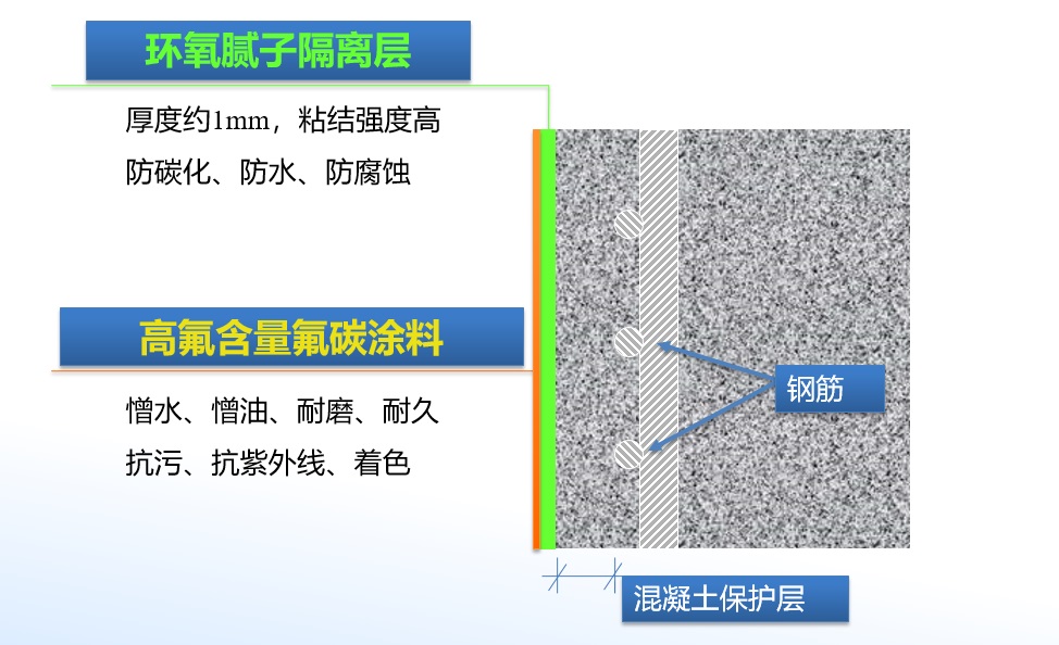 混凝土表面涂層技術(shù)是一種針對鋼筋混凝土結(jié)構(gòu)經(jīng)濟有效的防護措施,主要是利用涂層的屏蔽作用,隔絕水、氯離子、CO2、酸雨等介質(zhì)的腐蝕,起到對混凝土結(jié)構(gòu)的保護作用。隨著加固改造和城市更新的快速發(fā)展,涂裝技術(shù)將在既有建筑、交通、水利等領(lǐng)域混凝土耐久性的維護中得到很好的應(yīng)用。區(qū)別于傳統(tǒng)的滲透型和成膜型表面防護體系,隔離型涂層防護體系由環(huán)氧膩子內(nèi)層和高氟含量氟碳涂料外層構(gòu)成,能有效提高原有混凝土結(jié)構(gòu)的耐久性和適用性。