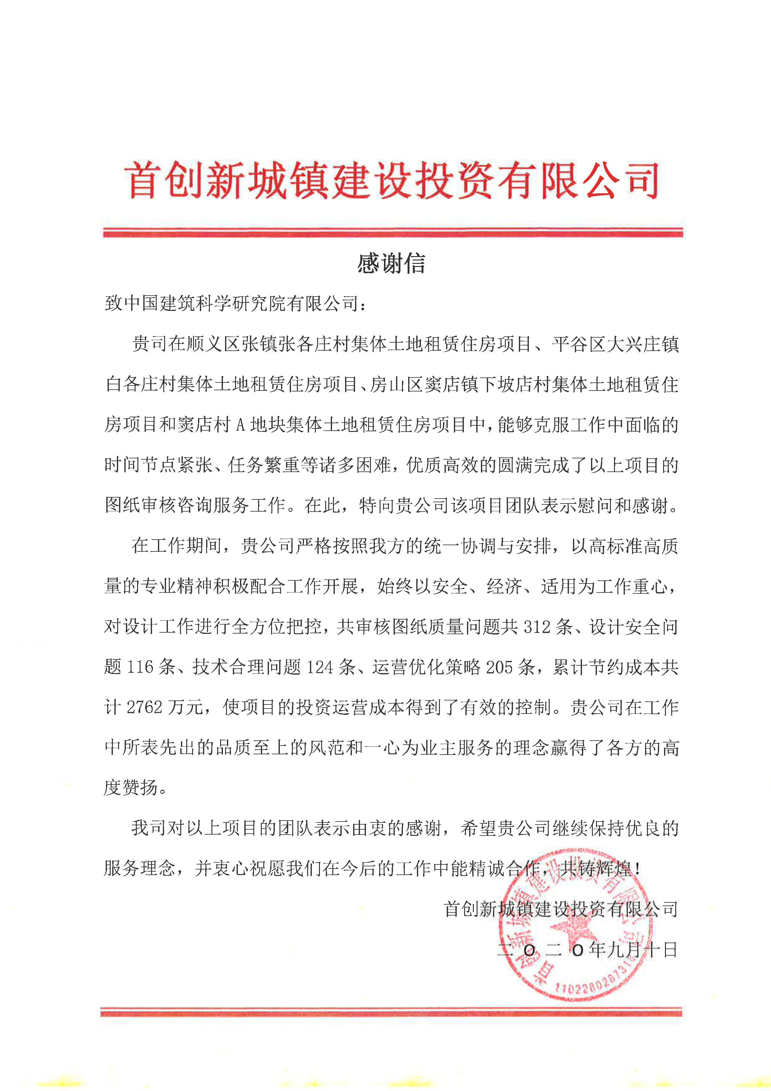2020年9月10日,建筑設(shè)計院收到首創(chuàng)新城鎮(zhèn)建設(shè)投資有限公司發(fā)來的感謝信。業(yè)主在感謝信中指出“項目組以高標準高質(zhì)量的專業(yè)精神積極配合業(yè)主開展工作,對設(shè)計工作進行全方位把控,共審核圖紙質(zhì)量問題312條、設(shè)計安全問題116條、技術(shù)合理問題124條、運營優(yōu)化策略205條,使項目的投資運營成本得到了有效地控制。”