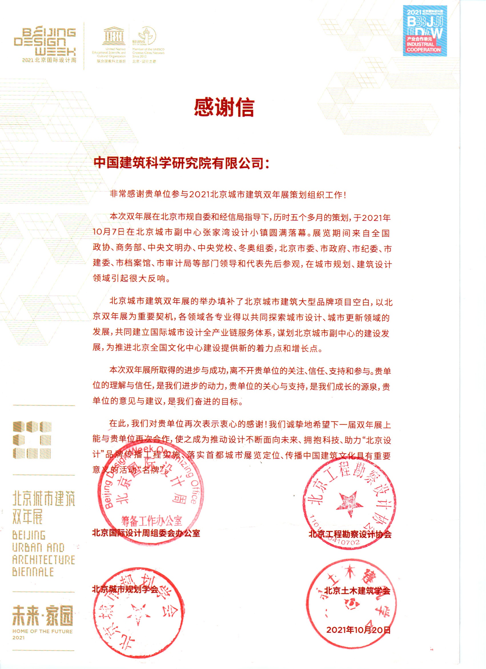 10月25日,公司收到北京國際設(shè)計周組委會辦公室、北京工程勘察設(shè)計協(xié)會、北京城市規(guī)劃學(xué)會、北京土木建筑學(xué)會聯(lián)合發(fā)來的感謝信,感謝公司參與2021北京城市建筑雙年展的策劃組織工作。