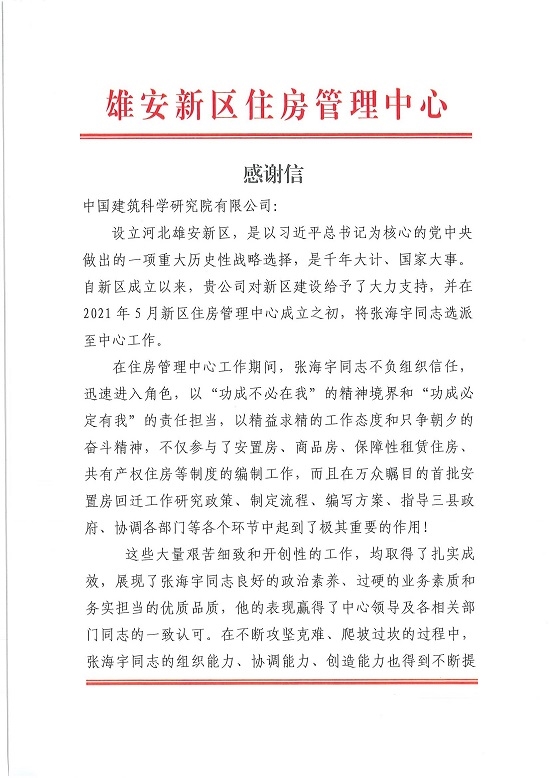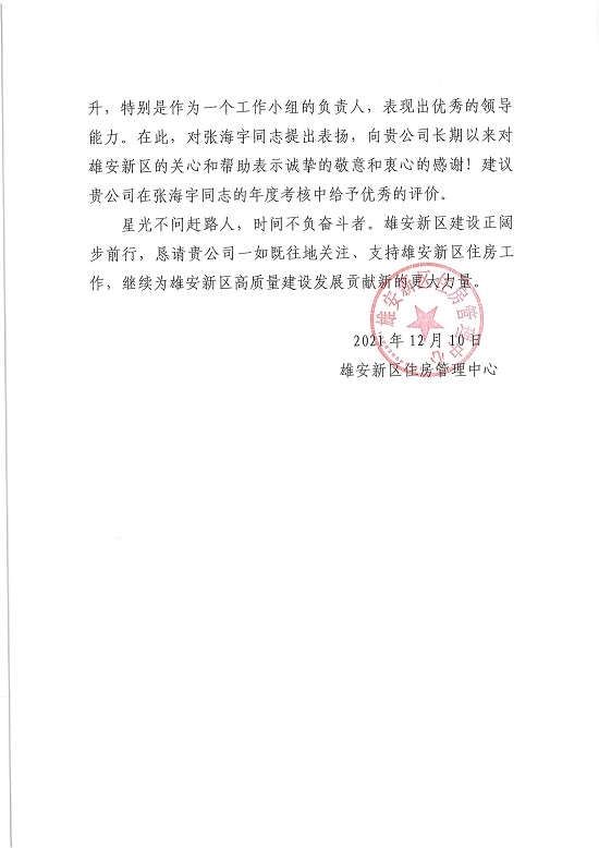 12月21日,公司建筑設計院收到雄安新區(qū)住房管理中心的感謝信。雄安新區(qū)住房管理中心在信中感謝設計院長期以來對雄安新區(qū)的關心和幫助,并對設計院選派至住房管理中心工作的同志進行表揚。