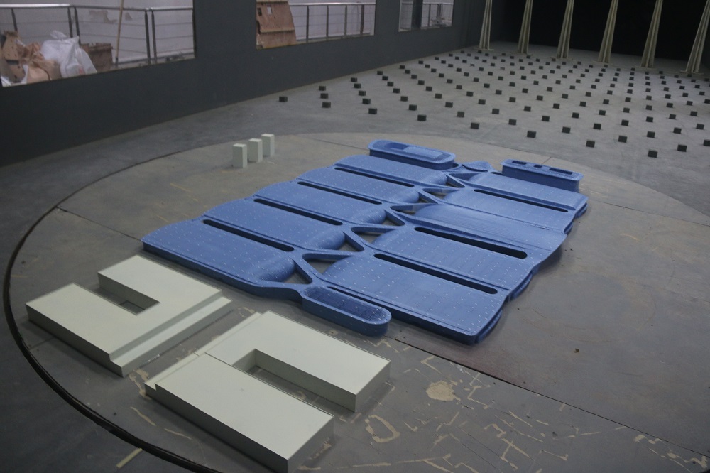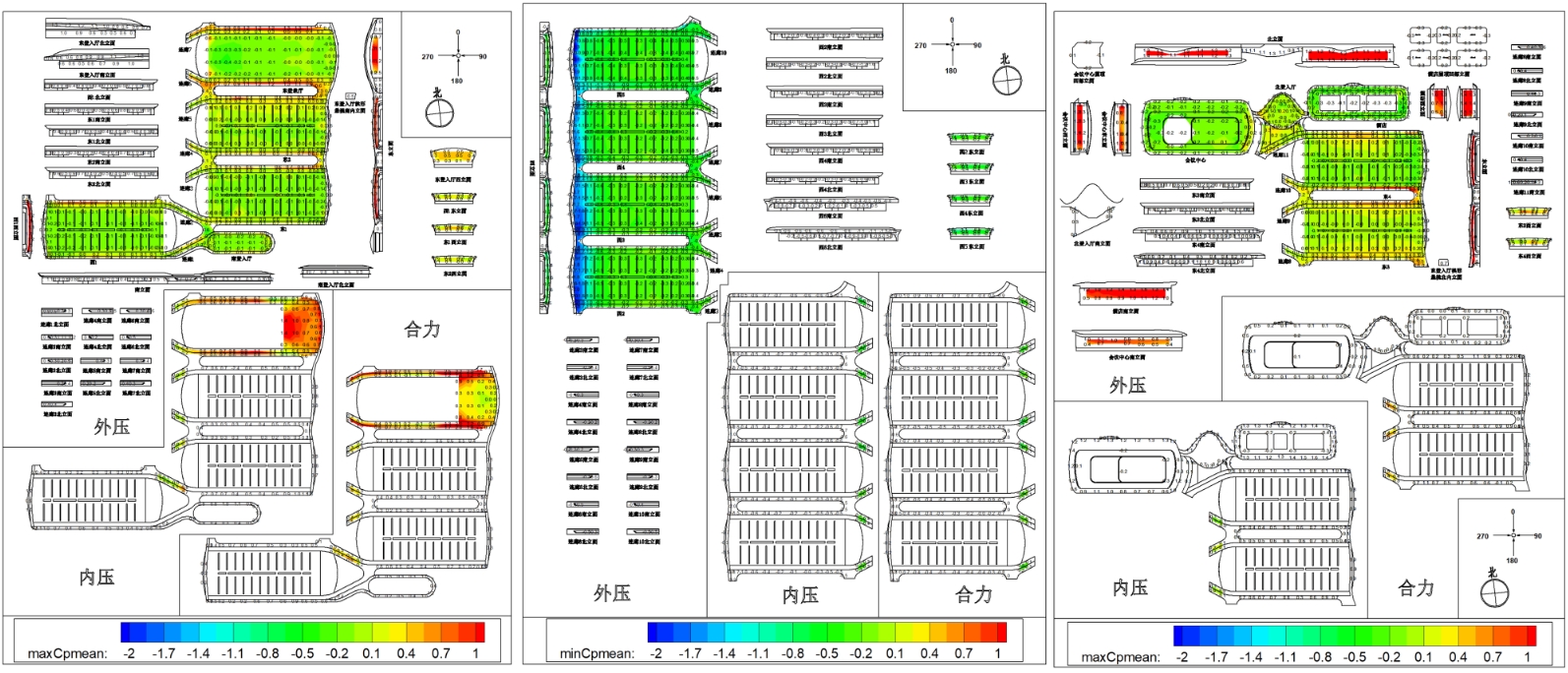 中建研科技工程咨詢?cè)O(shè)計(jì)院抗風(fēng)團(tuán)隊(duì)負(fù)責(zé)項(xiàng)目的風(fēng)工程專項(xiàng)研究工作,為主體結(jié)構(gòu)和圍護(hù)結(jié)構(gòu)設(shè)計(jì)工作提供了取值依據(jù),保證了結(jié)構(gòu)安全和設(shè)計(jì)高效經(jīng)濟(jì)。新國展二期由多個(gè)場館通過連廊聯(lián)通,外立面造型多變,場館之間存在風(fēng)荷載干擾效應(yīng),風(fēng)壓分布復(fù)雜;其展廳為大跨空間結(jié)構(gòu),風(fēng)荷載往往是控制性荷載,風(fēng)荷載的取值直接關(guān)系結(jié)構(gòu)安全性和經(jīng)濟(jì)性。通過剛性模型風(fēng)洞測壓試驗(yàn),確定用于圍護(hù)結(jié)構(gòu)設(shè)計(jì)的風(fēng)荷載標(biāo)準(zhǔn)值和建筑表面風(fēng)壓時(shí)程;進(jìn)而結(jié)合結(jié)構(gòu)設(shè)計(jì)模型,進(jìn)行風(fēng)致振動(dòng)分析,獲得主體結(jié)構(gòu)設(shè)計(jì)風(fēng)荷載取值。