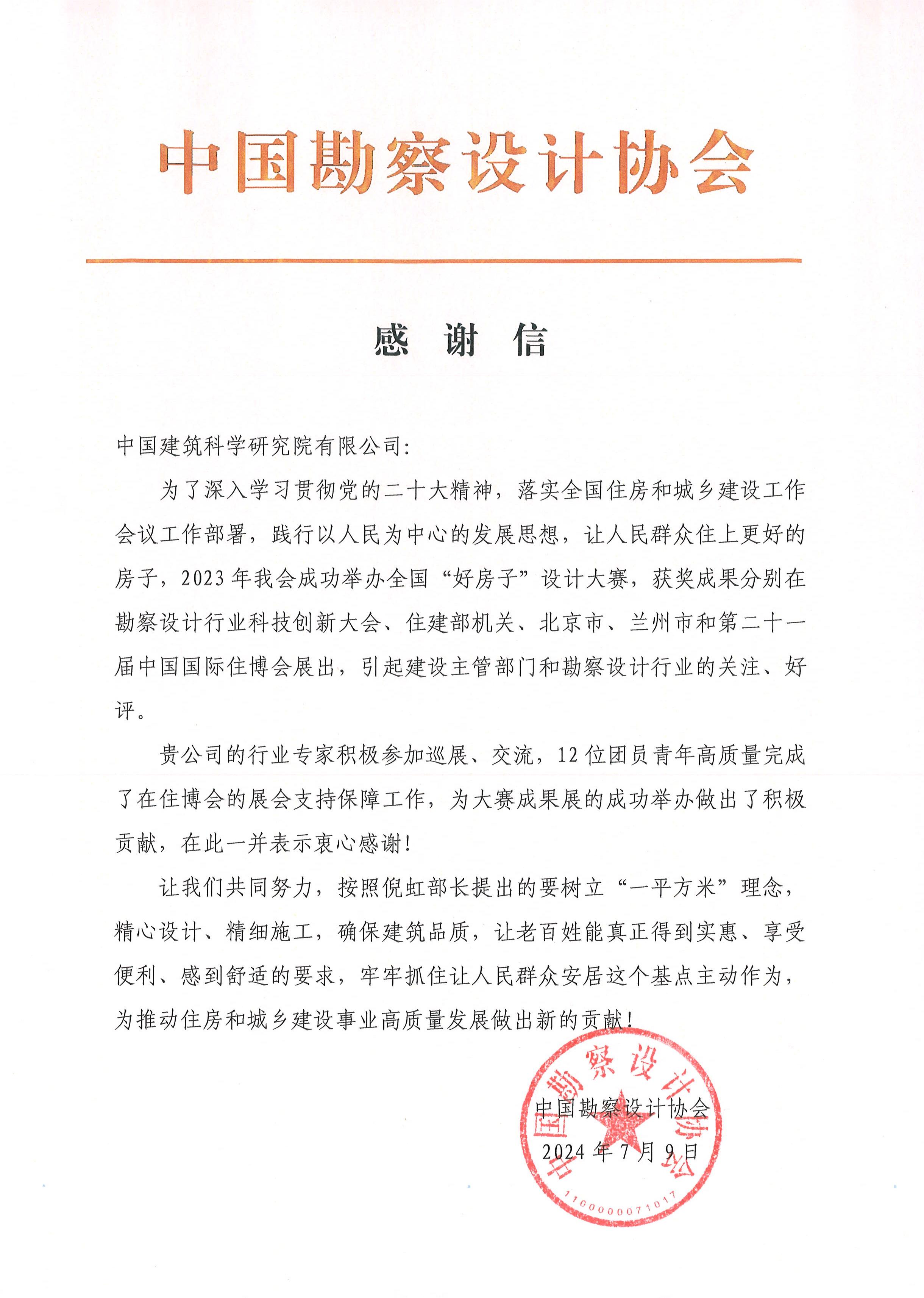 近日,中國(guó)建研院收到中國(guó)勘察設(shè)計(jì)協(xié)會(huì)(以下簡(jiǎn)稱“中設(shè)協(xié)”)發(fā)來(lái)的感謝信,對(duì)中國(guó)建研院為中設(shè)協(xié)全國(guó)“好房子”設(shè)計(jì)大賽成果展成功舉辦作出的積極貢獻(xiàn)表示衷心感謝。