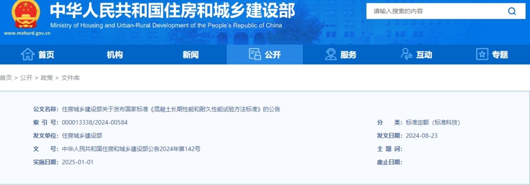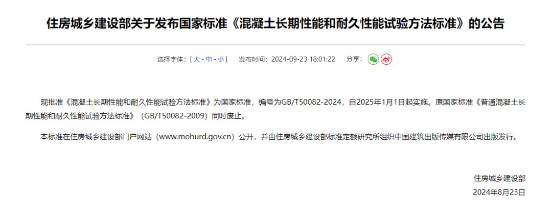9月23日,住房城鄉(xiāng)建設(shè)部發(fā)布《混凝土長期性能和耐久性能試驗(yàn)方法標(biāo)準(zhǔn)》(GB/T50082-2024),自2025年1月1日起實(shí)施。該標(biāo)準(zhǔn)由中國建研院主編,中建研科技承擔(dān)主要編制工作,其發(fā)布標(biāo)志著我國三大混凝土性能試驗(yàn)方法標(biāo)準(zhǔn)的新一輪更新完善圓滿完成,并全部進(jìn)入實(shí)施階段。