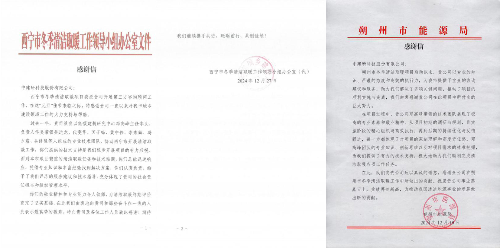 近日,中國(guó)建研院中建研科技收到西寧市冬季清潔取暖工作領(lǐng)導(dǎo)小組和朔州市能源局的感謝信,信中對(duì)中建研科技在冬季清潔取暖工作中的突出貢獻(xiàn)表示高度肯定和誠(chéng)摯感謝。