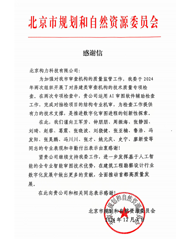 李云鵬對構(gòu)力科技在智能審圖方面取得的成效給予高度肯定。他指出,在2024年審查機(jī)構(gòu)技術(shù)質(zhì)量專項(xiàng)檢查過程中,構(gòu)力科技的AI審圖軟件出色地完成了輔助檢查任務(wù),完成了預(yù)期的目標(biāo)。希望構(gòu)力科技一如既往服務(wù)北京市智能審圖工作,結(jié)合不斷豐富的實(shí)際項(xiàng)目校審案例,深挖智能審圖的多元應(yīng)用路徑,精心打磨實(shí)施方案,持之以恒助力北京市施工圖質(zhì)量持續(xù)提升,為構(gòu)建全國標(biāo)桿式智能審圖管理體系、打造行業(yè)知識平臺添磚加瓦、貢獻(xiàn)力量。