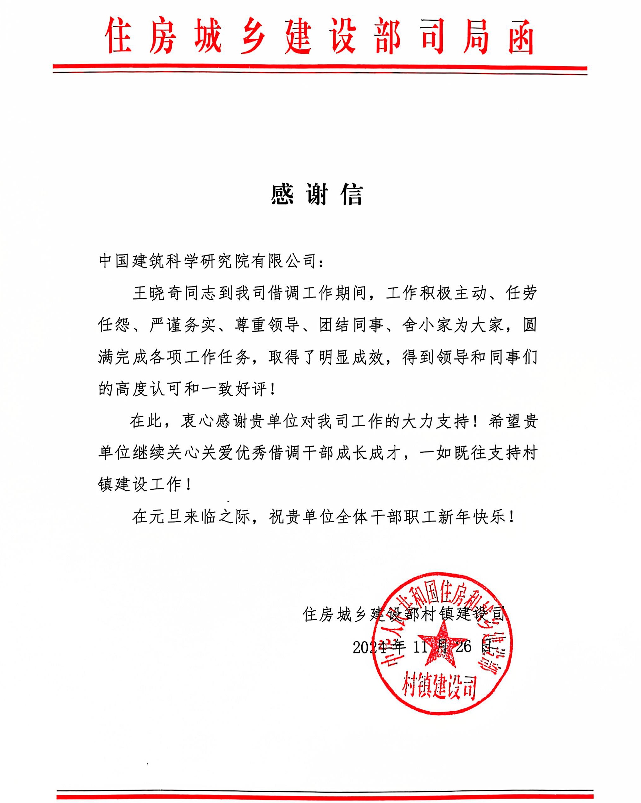 信中表示,中國建研院借調同志在村鎮(zhèn)建設司工作期間,積極主動,圓滿完成了各項工作任務,取得了明顯成效,得到領導和同事們的高度認可和一致好評。?