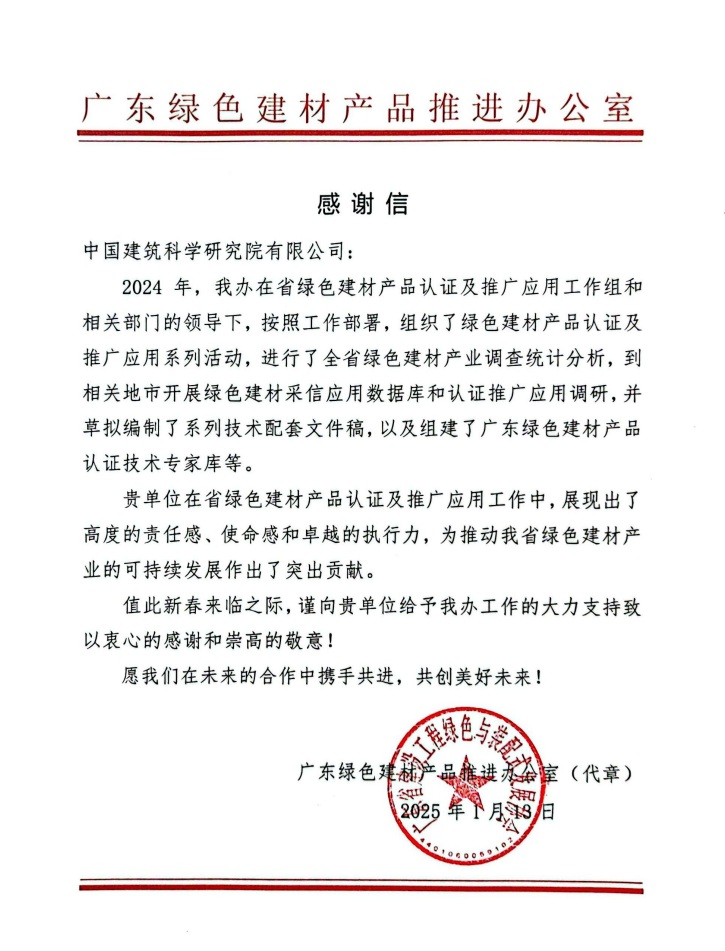 信中期待,希望能與中國建研院在未來的合作中攜手共進,共創(chuàng)美好未來。感謝信是對中國建研院在廣東省綠色建材產品認證及推廣應用方面工作成效的高度認可,更為雙方未來在綠色建材領域的深入合作奠定了堅實基礎。