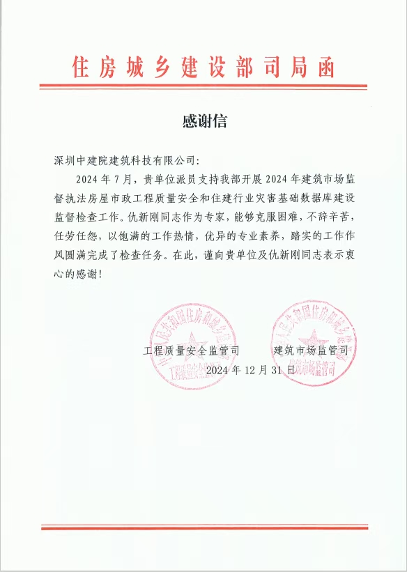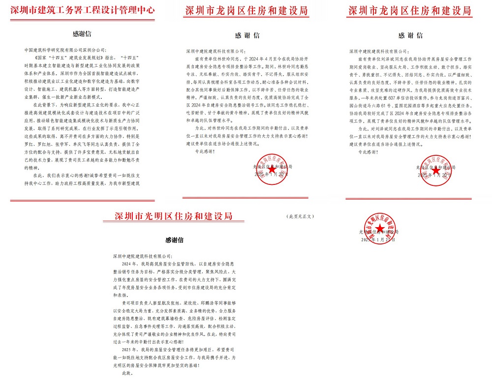近日,中國建研院深圳分公司接連收到來自政府主管部門、中央企業(yè)及街道辦事處的多封感謝信,對深圳分公司在2024年度建筑市場監(jiān)督執(zhí)法、房屋市政工程質(zhì)量安全、住建行業(yè)災(zāi)害基礎(chǔ)數(shù)據(jù)庫建設(shè)等工作中作出的卓越貢獻(xiàn)表示高度肯定。這些感謝信來自住房城鄉(xiāng)建設(shè)部工程質(zhì)量安全監(jiān)管司、建筑市場監(jiān)督司,深圳市建設(shè)工務(wù)署、光明區(qū)住房和建設(shè)局、龍崗區(qū)住房和建設(shè)局,以及深圳市玉塘街道、園山街道、橫崗街道、布吉街道、平湖街道、新橋街道等基層單位。