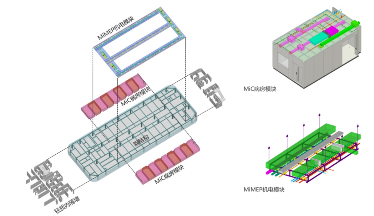 嵌入式MiC模塊化病房集成了模塊結(jié)構(gòu)、機(jī)電和裝修,對(duì)標(biāo)先進(jìn)制造業(yè),旨在打造高度集成化、工業(yè)化的產(chǎn)品。在工廠采用數(shù)字化設(shè)備完成模塊生產(chǎn)與安裝,隨后運(yùn)輸至現(xiàn)場(chǎng)快速組裝,在大幅縮短工期的同時(shí)提升了建筑品質(zhì)。
