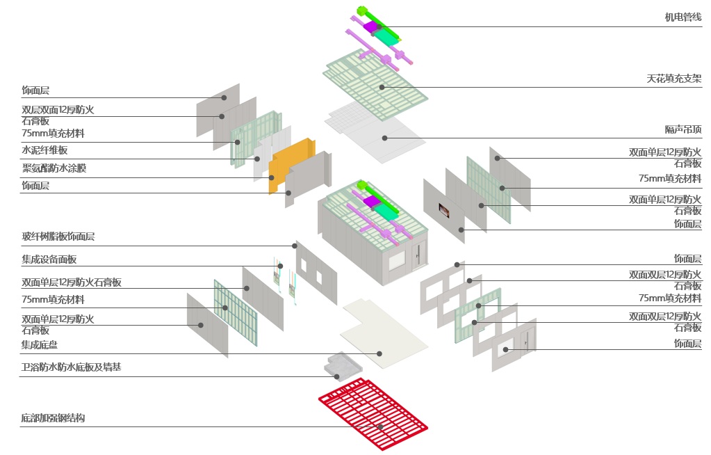 深圳市人民醫(yī)院寶安醫(yī)院感染性疾病防治中心結(jié)構(gòu)主體采用鋼結(jié)構(gòu),內(nèi)部采用嵌入式MiC(Modular Integrated Construction)模塊化病房及MiMEP(Module-based MiMEP)裝配式機(jī)電模塊集成建造技術(shù)。項(xiàng)目共采用101個(gè)模塊化病房,整體裝配率達(dá)80%以上,《建筑工業(yè)化評(píng)價(jià)標(biāo)準(zhǔn)》試評(píng)價(jià)等級(jí)為AA級(jí)裝配式建筑。項(xiàng)目將成為國(guó)內(nèi)首個(gè)永久性嵌入式MiC模塊化感染性防治病房,同時(shí)也是國(guó)內(nèi)首個(gè)“模塊化負(fù)壓感染防治病房”,為“模塊化機(jī)電+模塊化建筑”的集成建造方式提供了參考示范。