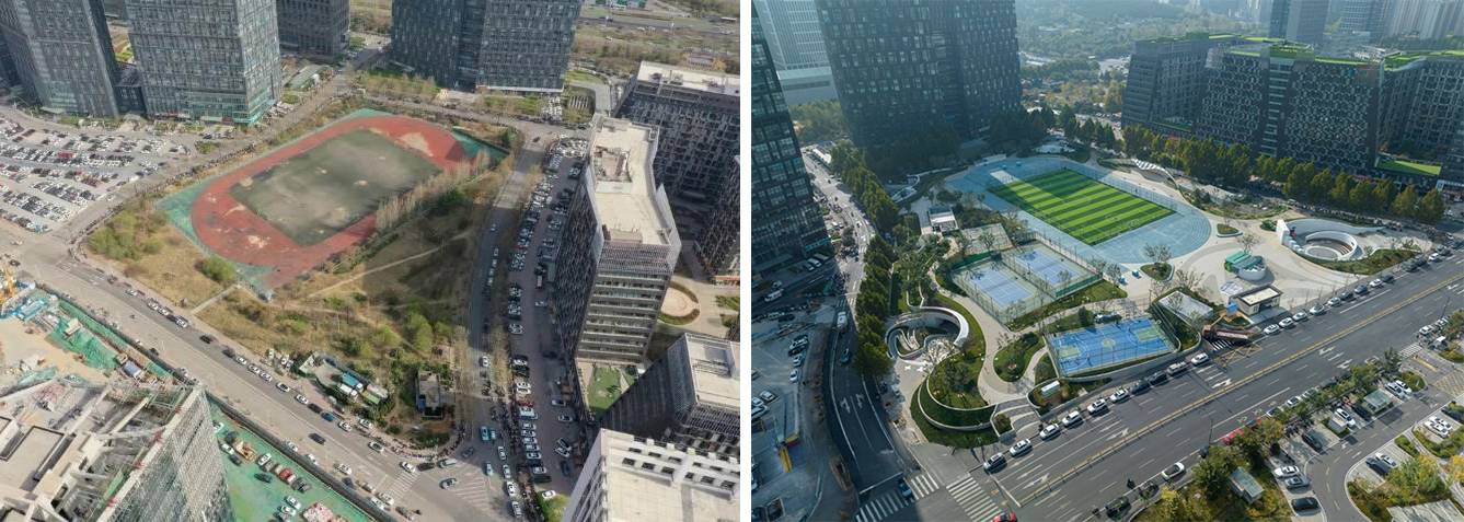 舜泰廣場智慧停車項目于2021年7月至11月設(shè)計,2021年11月開始施工,2023年10月建成投用。項目原址為舜泰廣場片區(qū)內(nèi)的社區(qū)運(yùn)動廣場,主要運(yùn)動設(shè)施為一處環(huán)形田徑跑道包圍的足球練習(xí)場。項目團(tuán)隊為解決體育場地設(shè)施陳舊單調(diào),片區(qū)停車設(shè)施不足,缺乏商業(yè)配套,城市風(fēng)貌雜亂等問題,通過以城市區(qū)域的有機(jī)更新為導(dǎo)向?qū)嵤┧刺┻\(yùn)動廣場改造,將原有體育設(shè)施升級為融田徑賽場、足球、籃球、網(wǎng)球、羽毛球、綠色健身步道等為一體的綜合體育建身活動場所。