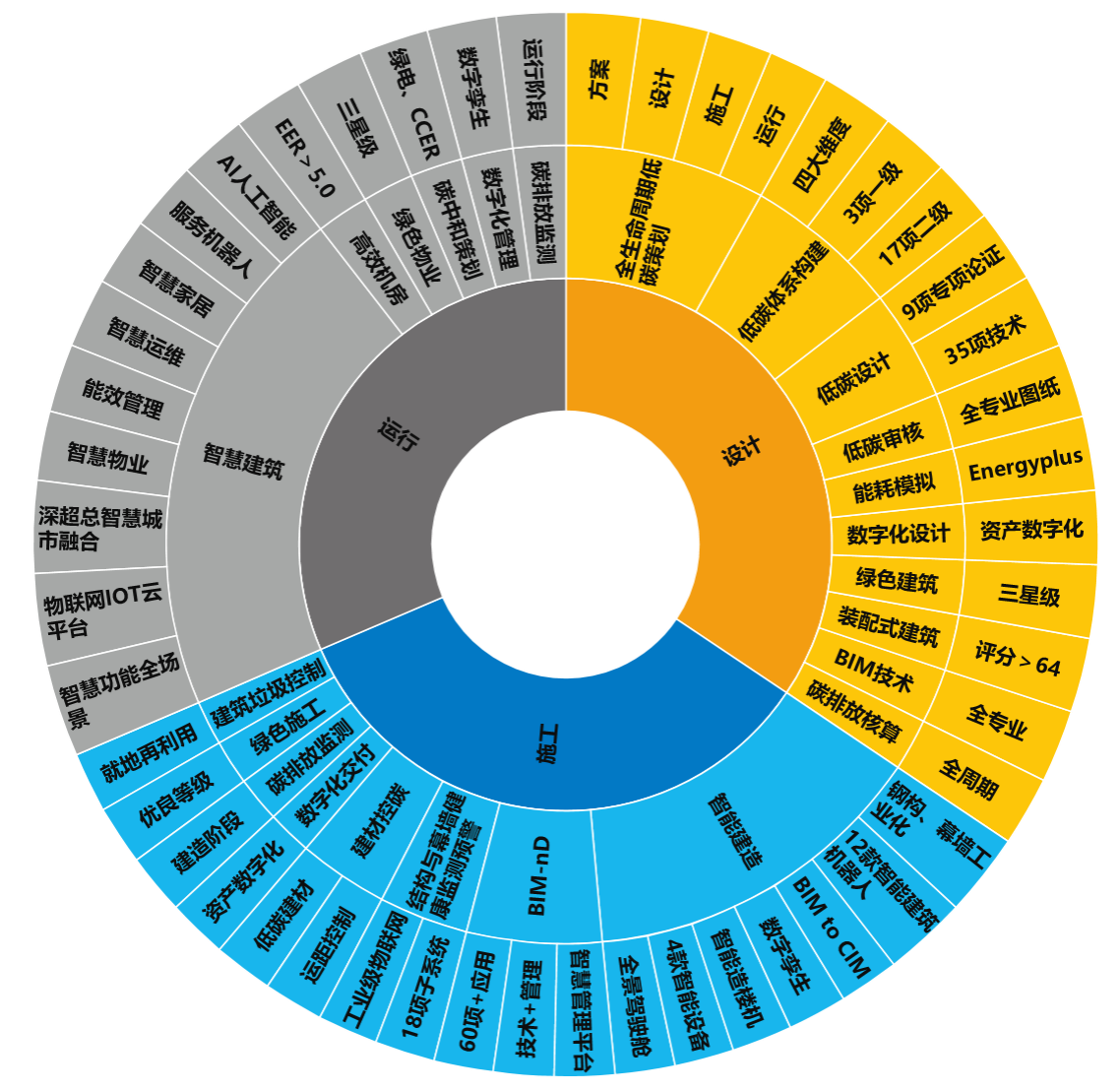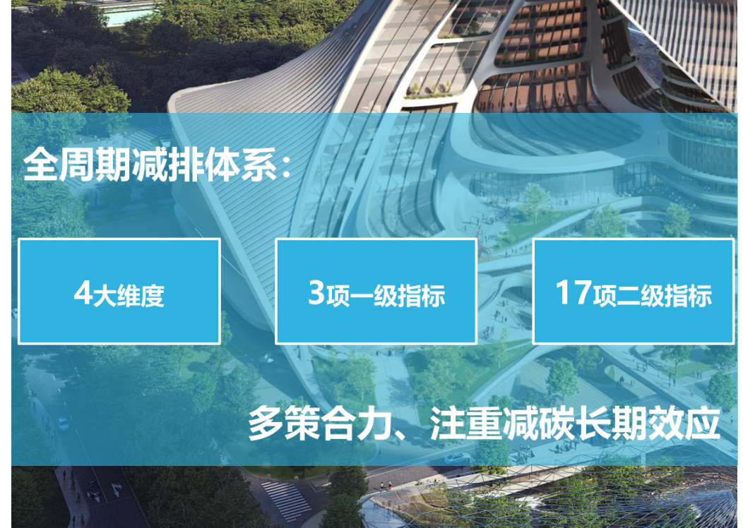 為實現(xiàn)真正的低碳目標(biāo),中國建研院深圳分公司幫助項目建設(shè)單位共同梳理主流標(biāo)準(zhǔn)體系和核心政策要求,圍繞低碳管理、低碳建造、低碳運行、碳中和四大維度,精心打造了一套包含3項一級先進(jìn)指標(biāo)、17項二級先進(jìn)指標(biāo)的低碳減排指標(biāo)體系。該體系覆蓋超高層項目開發(fā)的全周期,從規(guī)劃設(shè)計時的碳排放預(yù)評估,到施工建造過程中的低碳建材選用、建造碳排放監(jiān)測,再到運營階段的低碳運維建議,每一個環(huán)節(jié)都有明確的量化或定性要求。