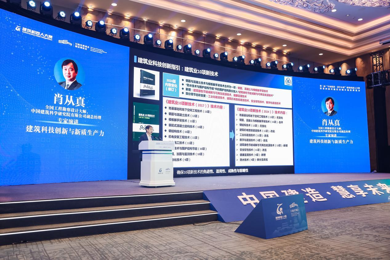 中國建研院黨委委員、副總經(jīng)理,全國工程勘察設(shè)計大師肖從真受邀參加開幕式及頒獎儀式,并作《建筑科技創(chuàng)新與新質(zhì)生產(chǎn)力》主旨報告。報告中從建筑業(yè)轉(zhuǎn)型及科技創(chuàng)新、智能建造與新質(zhì)生產(chǎn)力等方面作了闡述和展望。