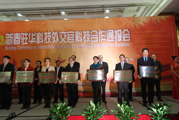 2012年1月12日,由北京市科委、北京市外事辦和北京市科協(xié)組織的2012新春駐華科技外交官科技合作通報(bào)會(huì)在京舉行,副市長(zhǎng)茍忠文出席會(huì)議。市科委為首批30家“北京市國(guó)際科技合作基地”授牌。我院院長(zhǎng)助理、科技處處長(zhǎng)王清勤代表我院參加會(huì)議并上臺(tái)接受授牌。
