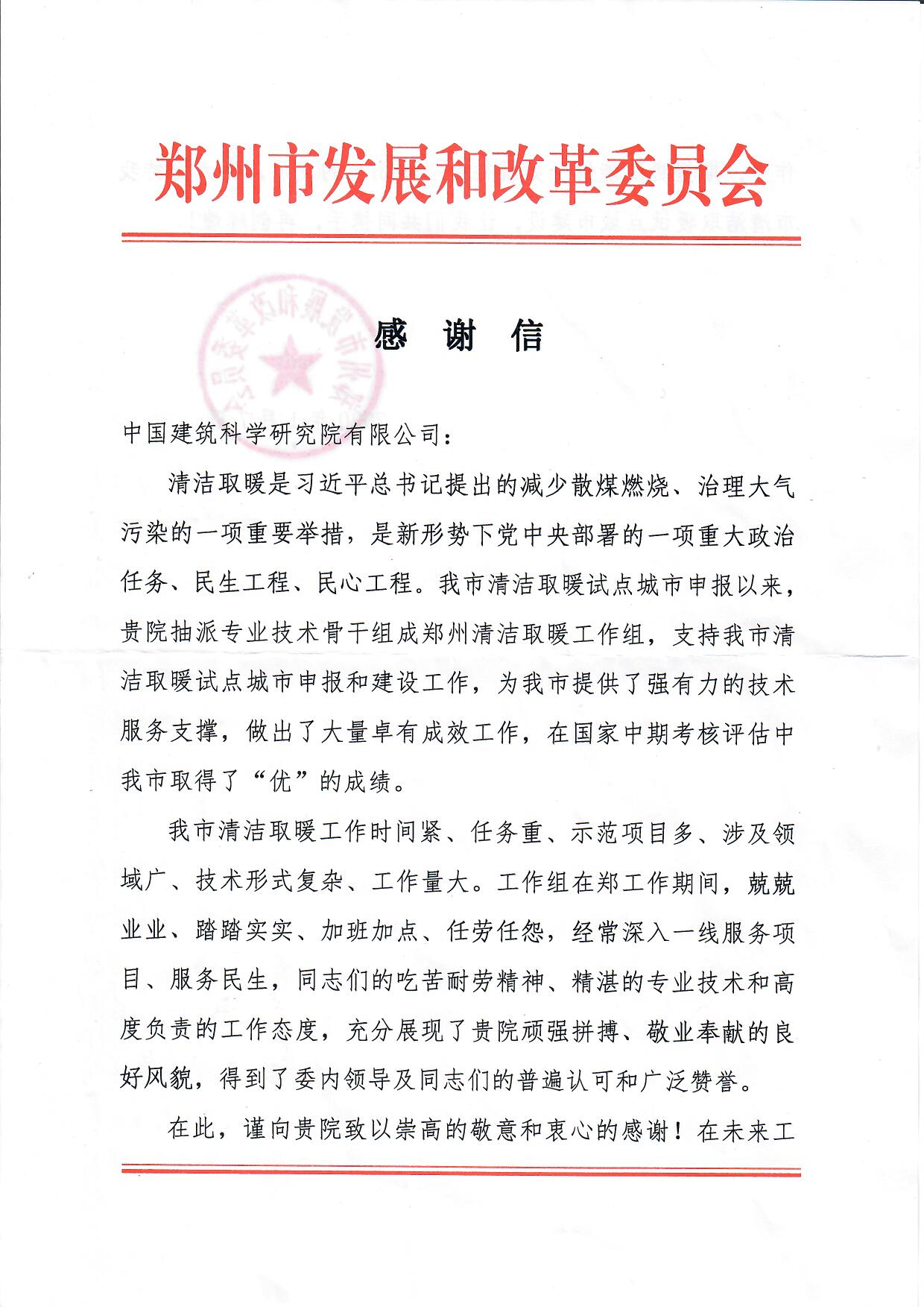 2020年1月7日,鄭州市發(fā)展和改革委員會向公司發(fā)來感謝信,感謝公司為鄭州市清潔取暖相關工作提供的技術服務支撐,并希望公司繼續(xù)支持該市的清潔取暖試點城市建設。