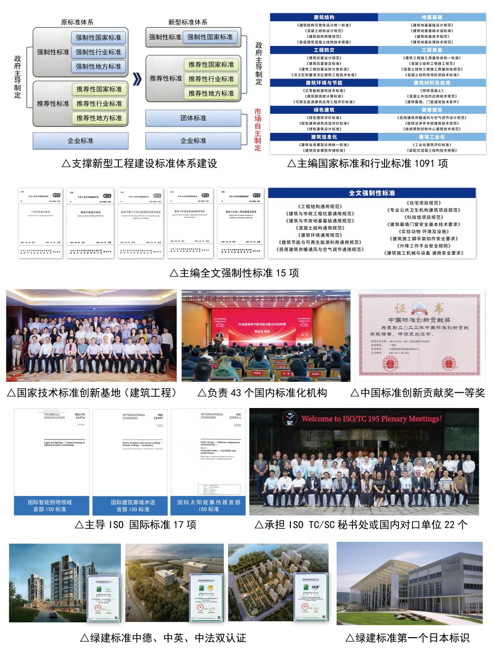 創(chuàng)建了我國第一代建筑工程標(biāo)準(zhǔn)體系,積極推動新時代標(biāo)準(zhǔn)化改革,助力新型標(biāo)準(zhǔn)體系建設(shè)。牽頭編制《工程結(jié)構(gòu)通用規(guī)范》等15項全文強(qiáng)制性標(biāo)準(zhǔn),累計主編、發(fā)布國家標(biāo)準(zhǔn)和行業(yè)標(biāo)準(zhǔn)1091項。承擔(dān)國家技術(shù)標(biāo)準(zhǔn)創(chuàng)新基地(建筑工程)等43個國內(nèi)標(biāo)準(zhǔn)化機(jī)構(gòu)秘書處工作,以及22個ISOTC/SC秘書處或國內(nèi)對口單位有關(guān)工作,主導(dǎo)ISO國際標(biāo)準(zhǔn)17項,為工程建設(shè)行業(yè)標(biāo)準(zhǔn)化高質(zhì)量發(fā)展做出積極貢獻(xiàn)。