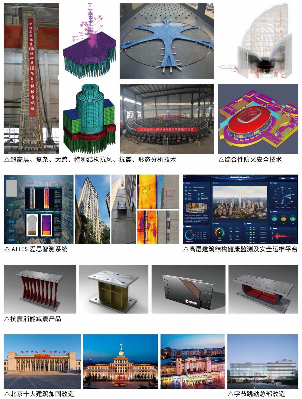 攻克了超高層、復(fù)雜、大跨、特種結(jié)構(gòu)抗風(fēng)、抗震、形態(tài)分析等關(guān)鍵技術(shù)難題,研發(fā)了面向新能源應(yīng)用及建筑本體使用安全的綜合性防火安全技術(shù),自主研發(fā)了愛思智測系統(tǒng)、高層建筑結(jié)構(gòu)健康監(jiān)測、抗震消能減震等產(chǎn)品,實踐應(yīng)用覆蓋北京十大建筑加固改造、字節(jié)跳動總部改造等重點工程。