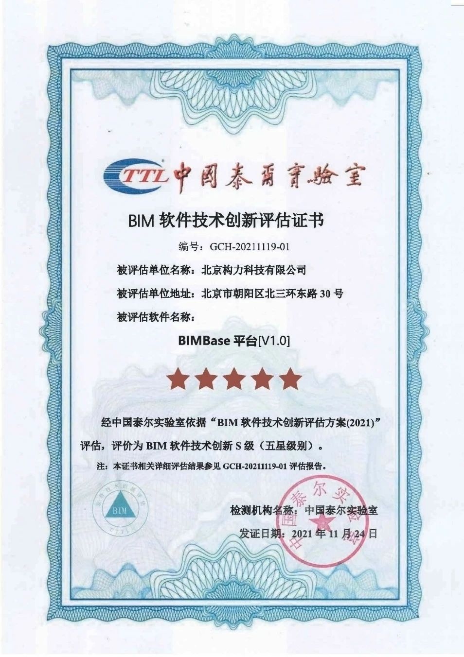 中國泰爾實(shí)驗(yàn)室BIM軟件技術(shù)創(chuàng)新評估證書