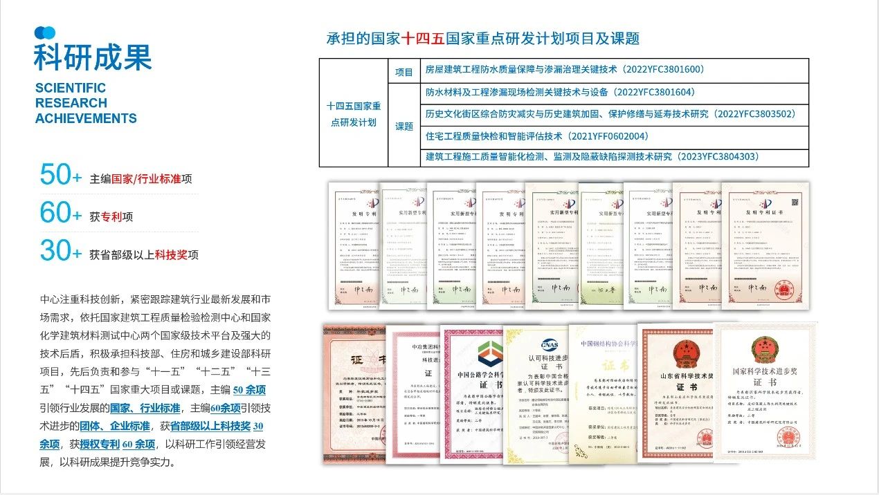 檢測中心注重科技創(chuàng)新,緊密跟蹤建筑行業(yè)最新發(fā)展與市場需求,積極承擔(dān)科技部、住房和城鄉(xiāng)建設(shè)部科研項(xiàng)目,先后負(fù)責(zé)和參與“十一五”“十二五”“十三五”“十四五”等國家重大項(xiàng)目(課題),緊跟國家科技發(fā)展戰(zhàn)略。擁有有效專利50余項(xiàng),主編國家及行業(yè)標(biāo)準(zhǔn)50余項(xiàng),為行業(yè)發(fā)展提供技術(shù)支撐。另外,建成國內(nèi)領(lǐng)先的建筑抗震實(shí)驗(yàn)室、風(fēng)洞實(shí)驗(yàn)室等,提升實(shí)驗(yàn)檢測能力。積極開展綠色建筑、新能源應(yīng)用等前沿技術(shù)研究,推動(dòng)建筑行業(yè)技術(shù)進(jìn)步。