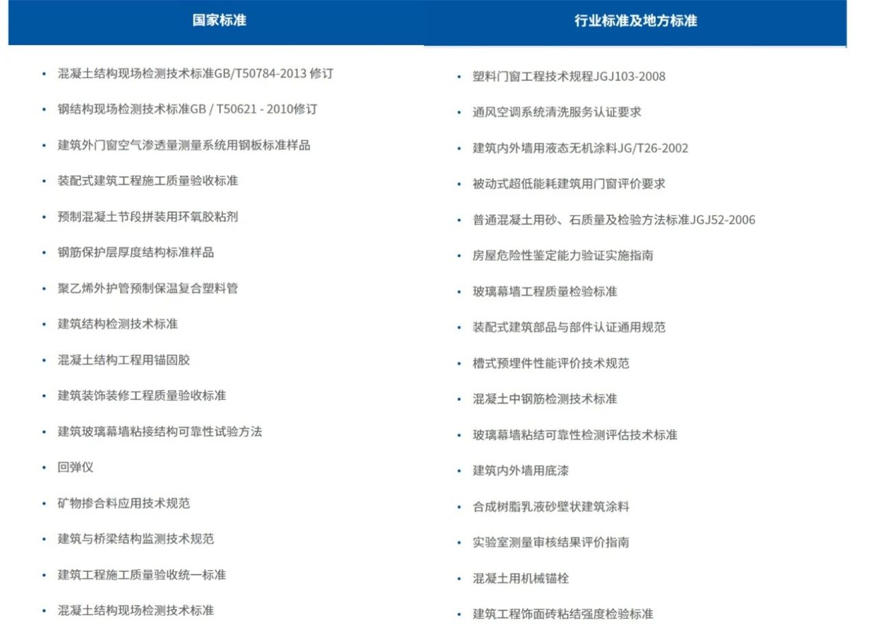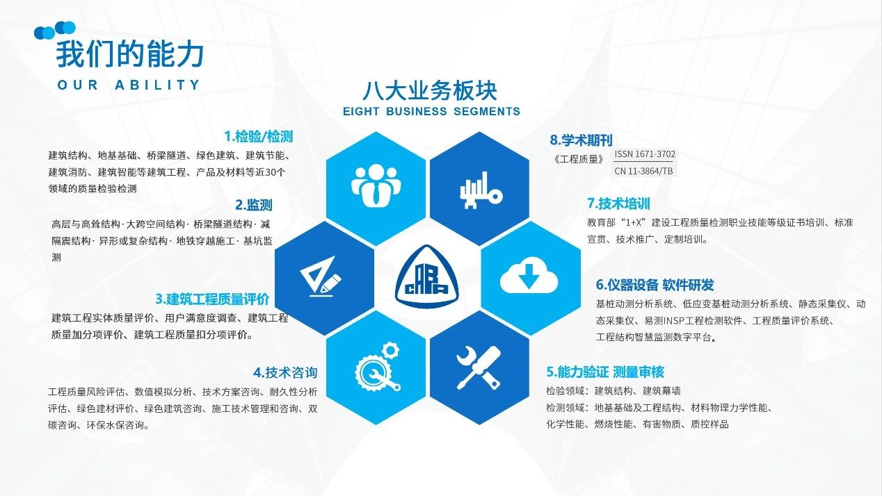 目前,檢測中心主要開展工程檢測鑒定、產(chǎn)品材料的檢驗(yàn)檢測、技術(shù)咨詢、能力驗(yàn)證、產(chǎn)品研發(fā)、職業(yè)技能等級培訓(xùn)及《工程質(zhì)量》雜志編輯出版等8板塊?,F(xiàn)已涵蓋15項(xiàng)專業(yè)資質(zhì),是北京市具有新建工程所有專項(xiàng)資質(zhì)的檢驗(yàn)檢測機(jī)構(gòu)。