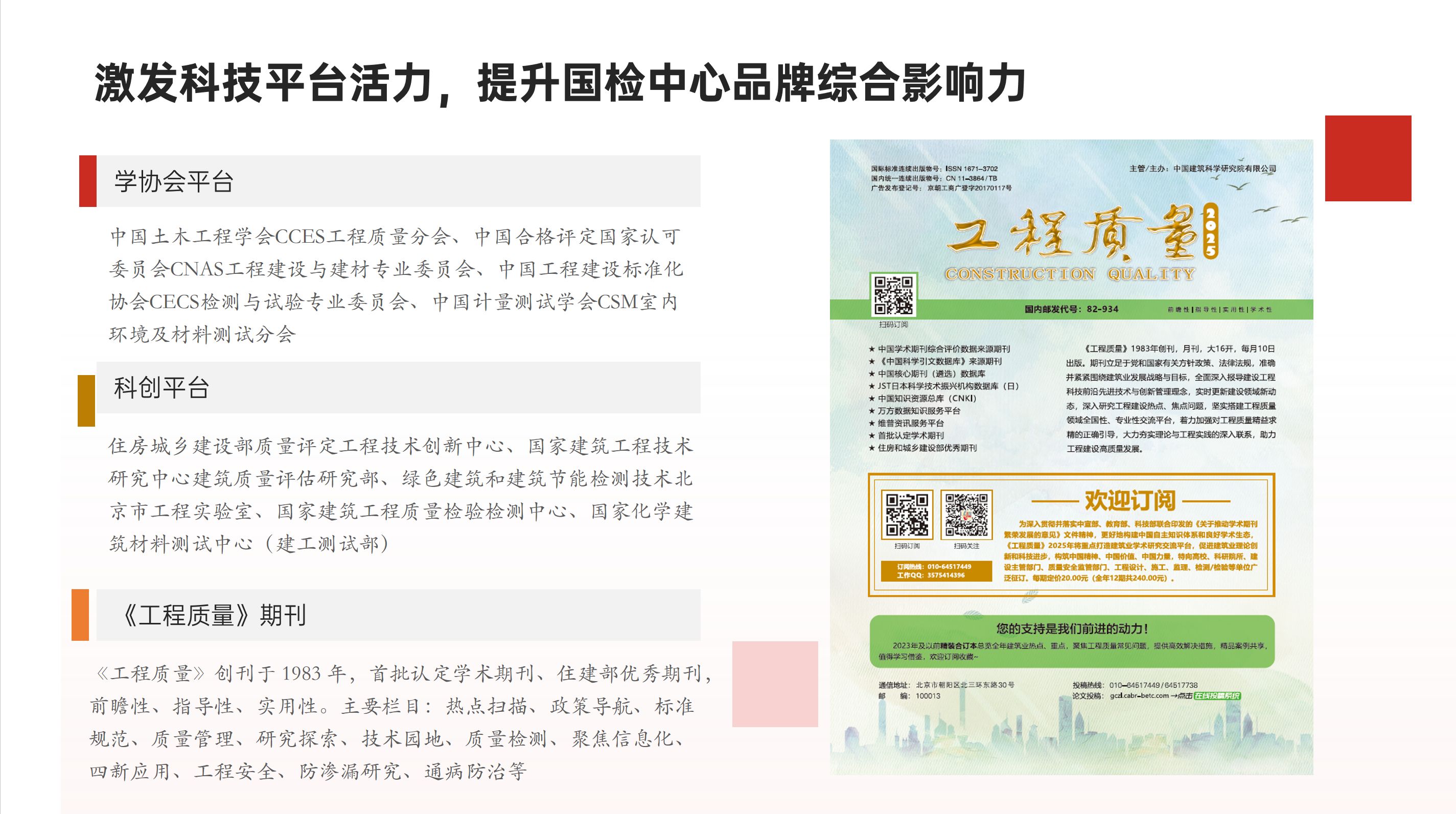 檢測中心以創(chuàng)新驅(qū)動(dòng)發(fā)展,構(gòu)建起“5個(gè)科創(chuàng)平臺 + 4個(gè)協(xié)會(huì)平臺”戰(zhàn)略矩陣,依托學(xué)術(shù)期刊《工程質(zhì)量》,形成產(chǎn)、學(xué)、研、媒一體化發(fā)展格局。通過開展期刊出版、學(xué)協(xié)會(huì)平臺建設(shè)、品牌會(huì)議組織、傳媒廣告、技能培訓(xùn)、行業(yè)服務(wù)、技術(shù)咨詢等多元業(yè)務(wù)協(xié)同發(fā)力,不僅激活平臺創(chuàng)新活力,更全方位提升了國檢中心的品牌綜合影響力,成為推動(dòng)我國建筑工程質(zhì)量檢驗(yàn)檢測領(lǐng)域技術(shù)革新、標(biāo)準(zhǔn)升級與產(chǎn)業(yè)進(jìn)步的核心力量。