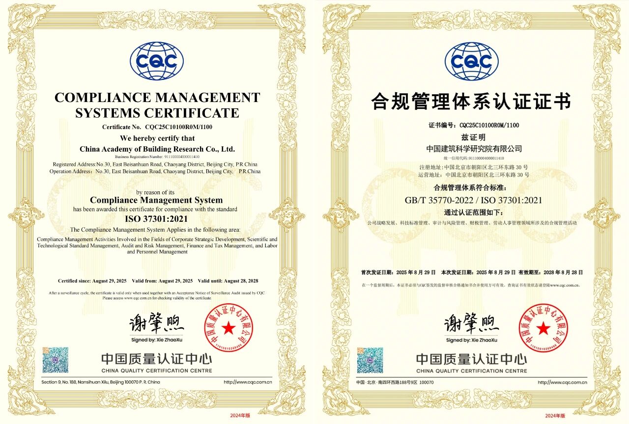 近日,中國(guó)建研院成功通過(guò)中國(guó)質(zhì)量認(rèn)證中心(CQC)合規(guī)管理體系審核,獲得國(guó)際標(biāo)準(zhǔn)ISO37301:2021和國(guó)家標(biāo)準(zhǔn)GB/T35770-2022認(rèn)證證書(shū),標(biāo)志著公司在合規(guī)治理現(xiàn)代化進(jìn)程中邁出堅(jiān)實(shí)一步。
