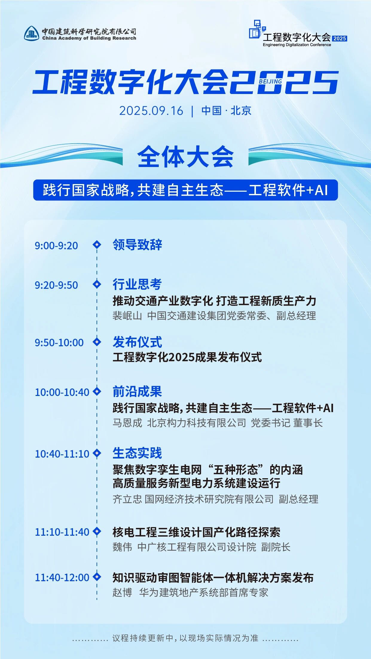 為貫徹落實(shí)黨的二十屆三中全會(huì)精神,響應(yīng)“抓緊打造自主可控的產(chǎn)業(yè)鏈供應(yīng)鏈、健全強(qiáng)化工業(yè)軟件發(fā)展"要求,深化工業(yè)軟件核心技術(shù)攻關(guān)、構(gòu)建開放協(xié)同的國產(chǎn)工業(yè)軟件生態(tài),中國建筑科學(xué)研究院有限公司擬于2025年9月16日舉辦“工程數(shù)字化大會(huì)2025”。會(huì)議以“踐行國家戰(zhàn)略,共建自主生態(tài)——工程軟件+AI”為主題,將重點(diǎn)聚焦工程設(shè)計(jì)軟件核心價(jià)值、AI驅(qū)動(dòng)的智能工程實(shí)踐、BIMBase平臺(tái)能力及其在工業(yè)、電力、建筑、交通等領(lǐng)域的國產(chǎn)化替代應(yīng)用情況,為工程數(shù)字化發(fā)展注入新動(dòng)能。誠摯邀請(qǐng)您蒞臨此次盛會(huì)!