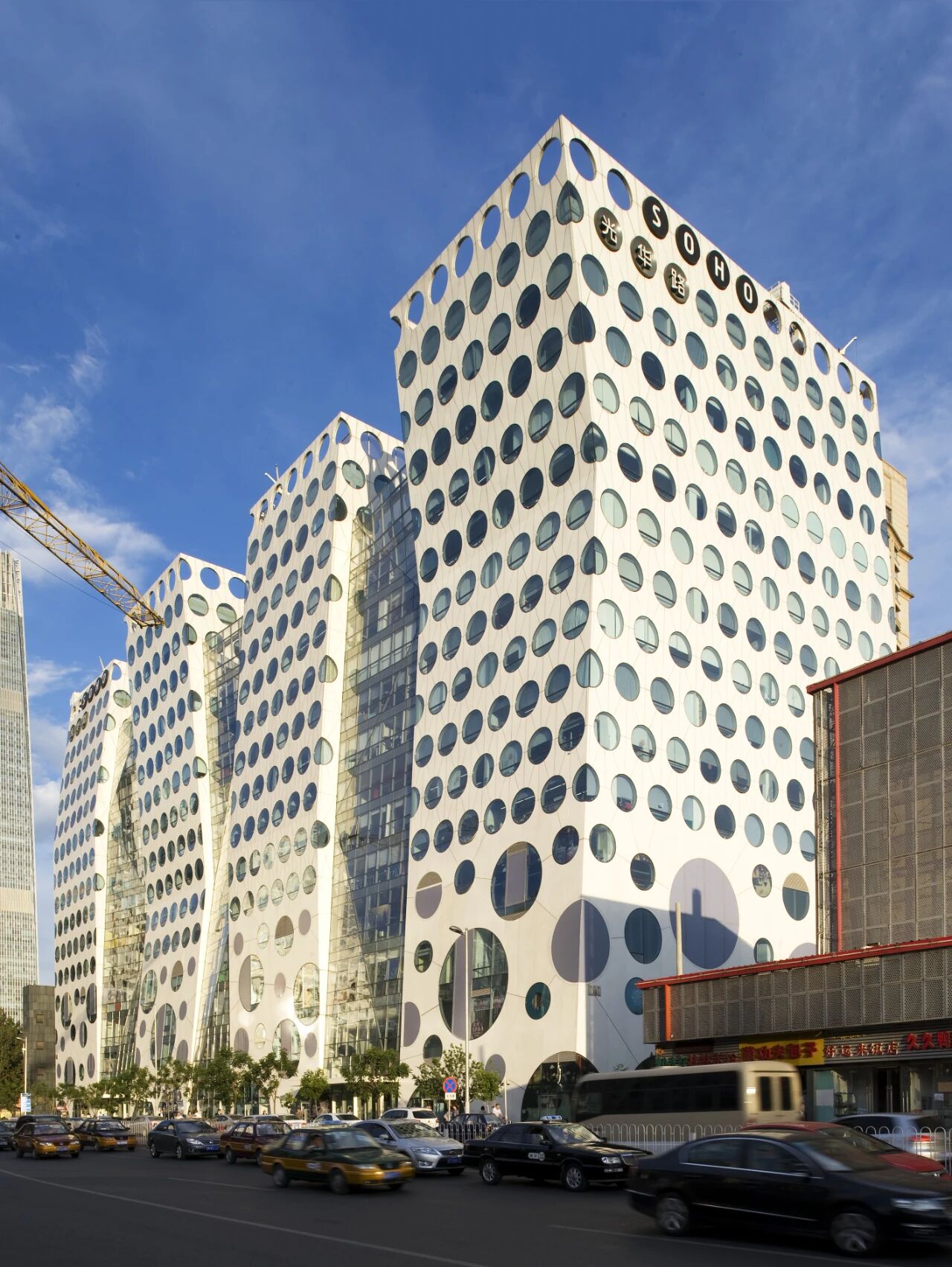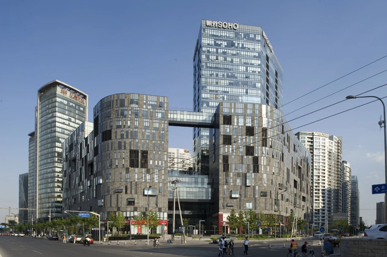 北京朝外SOHO地處北京CBD中央商務(wù)區(qū)內(nèi),緊臨朝外商圈與第一使館區(qū)隔路相望的三圈交匯黃金地帶,是集商業(yè),辦公為一體的綜合性建筑,總建筑面積15.12萬平米。項(xiàng)目由中國建研院建筑設(shè)計(jì)院和履露齋建筑師事務(wù)所聯(lián)合設(shè)計(jì)完成,建筑組群由兩棟11層的環(huán)狀裙樓和一棟25層的塔樓構(gòu)成。地上6~25層為辦公部分,可為入駐企業(yè)提供多樣化的辦公空間選擇。裙樓立面用斑駁的黑色玄武巖拼接出“城堡”的造型,塔樓如一把寶劍直刺天空。兩棟環(huán)狀裙樓之間是寬度18米的商業(yè)主街,每層均有樓梯、扶梯和連廊,在水平、垂直方向連接,形成一個(gè)有機(jī)的整體。